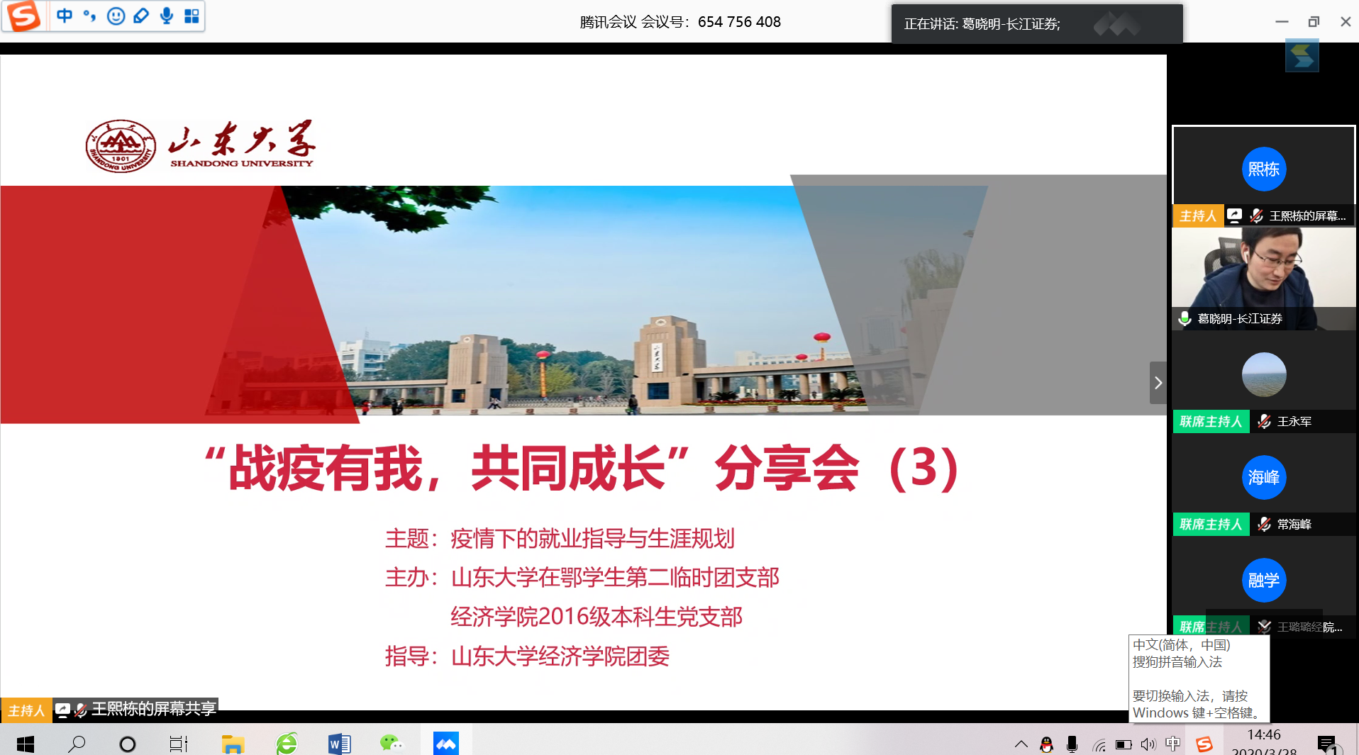 3月28日下午,由beats365亚洲版官网在鄂员工第二临时团支部和beats365亚洲版官网2016级本科生党支部联合主办的“战疫有我,共同成长”分享会第三期在线上举行。本次分享会邀请beats365亚洲版官网员工就业创业指导中心指导部主任常海峰老师,beats365亚洲版官网2012届硕士员工、长江证券人力资源部总经理葛晓明员工围绕“疫情下的就业指导与生涯规划”主题分享。