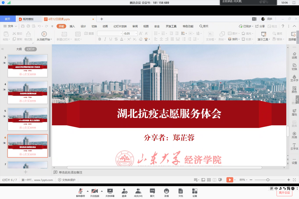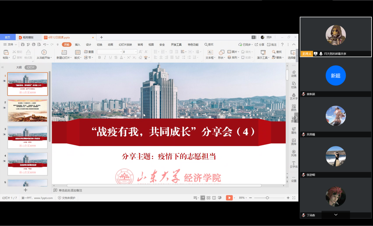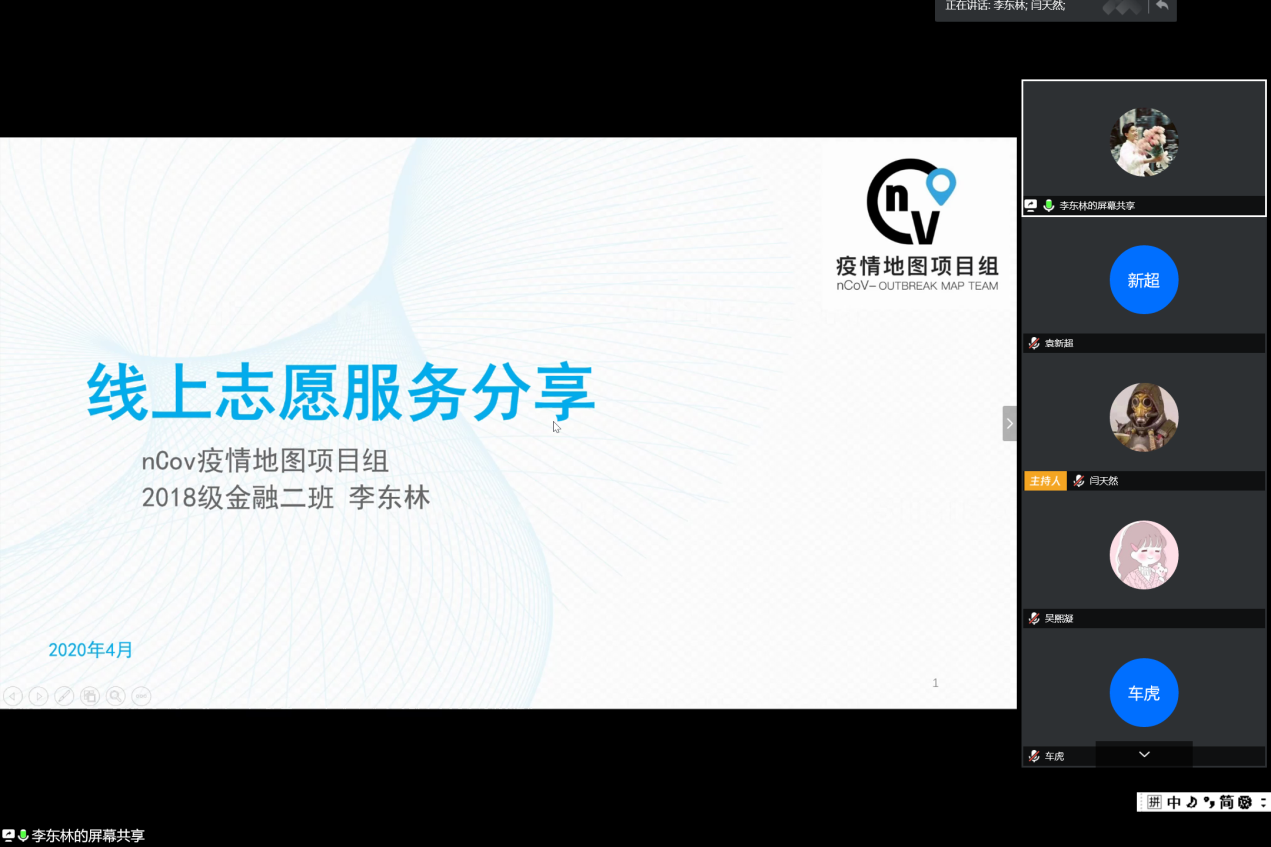 4月12日晚,beats365亚洲版官网员工组织与在鄂员工第二临时团支部在线联合举办“战疫有我,共同成长”第四期分享会。本次分享会主题是“疫情下的志愿担当”,邀请丁冠森、李东林、郑芷蓉、李思洁四位在疫情期间积极投身于志愿活动的经院学子,分享他们的心得与体会。