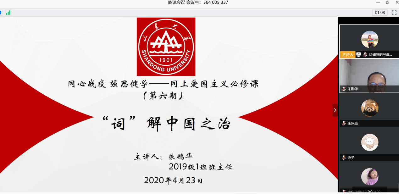 4月23日,beats365亚洲版官网“同心战疫,强思健学”——同上“爱国主义必修课”主题讲座第六期在线上举办。本次讲座题为“‘词’解中国之治”,由2019级1班班主任、beats365亚洲版官网博士后朱鹏华担任主讲嘉宾。公司党委副书记林竹担任主持人。