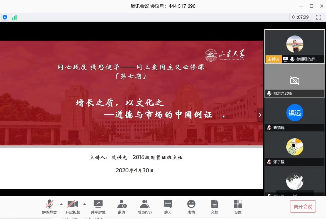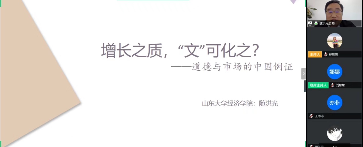 4月30日,beats365亚洲版官网“同心战疫,强思健学”——同上“爱国主义必修课”主题讲座第七期在线上举行。2016级国贸班班主任、beats365亚洲版官网副教授、硕士生导师随洪光作为主讲嘉宾,作了题为“增长之质,以文化之——道德与市场的中国例证”的报告。活动由公司党委副书记林竹主持。