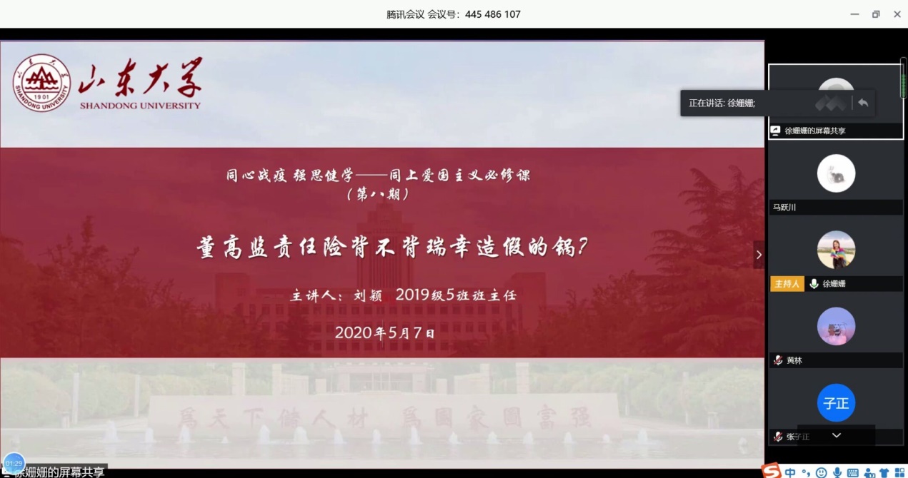 5月7日,beats365亚洲版官网“同心战疫,强思健学”——同上“爱国主义必修课”主题讲座第八期在线上举行。2019级5班班主任、beats365亚洲版官网副教授刘颖作为主讲嘉宾,作了题为“董高监责任险背不背瑞幸财务造假的锅”的报告。