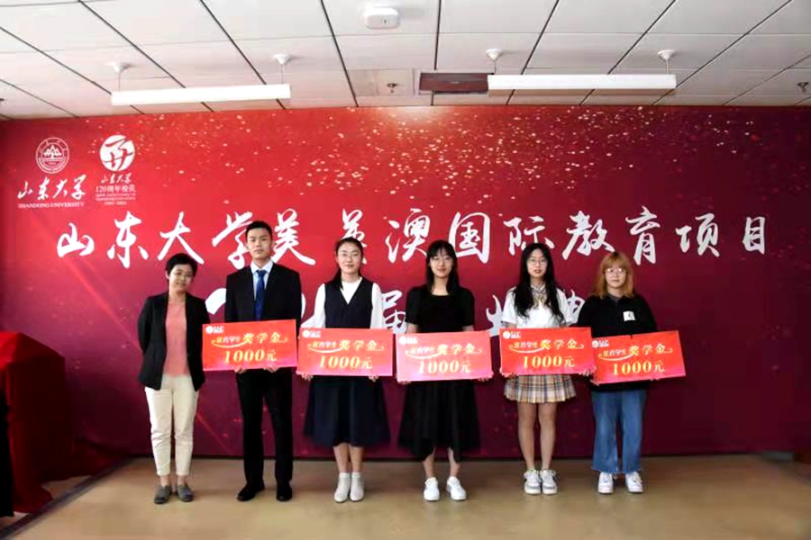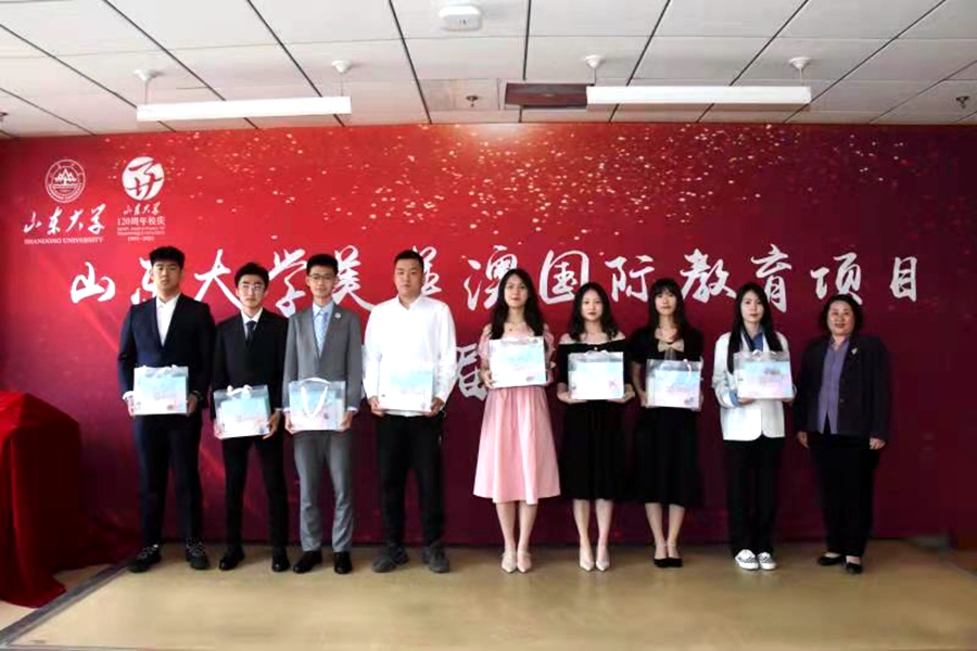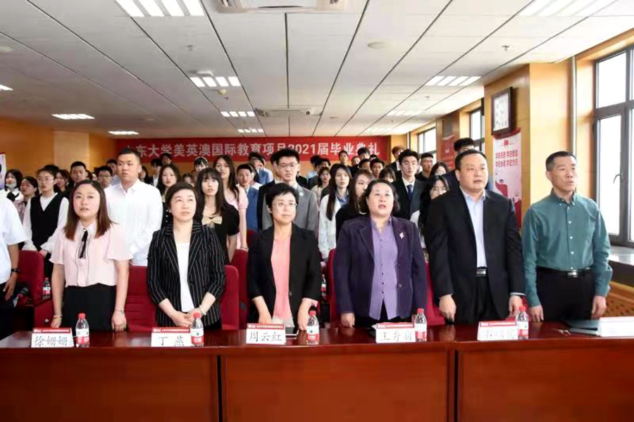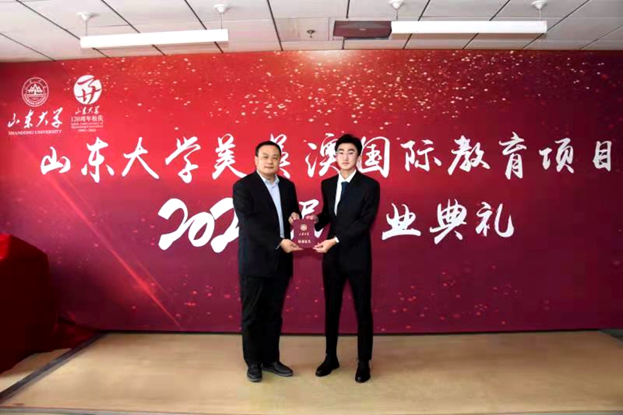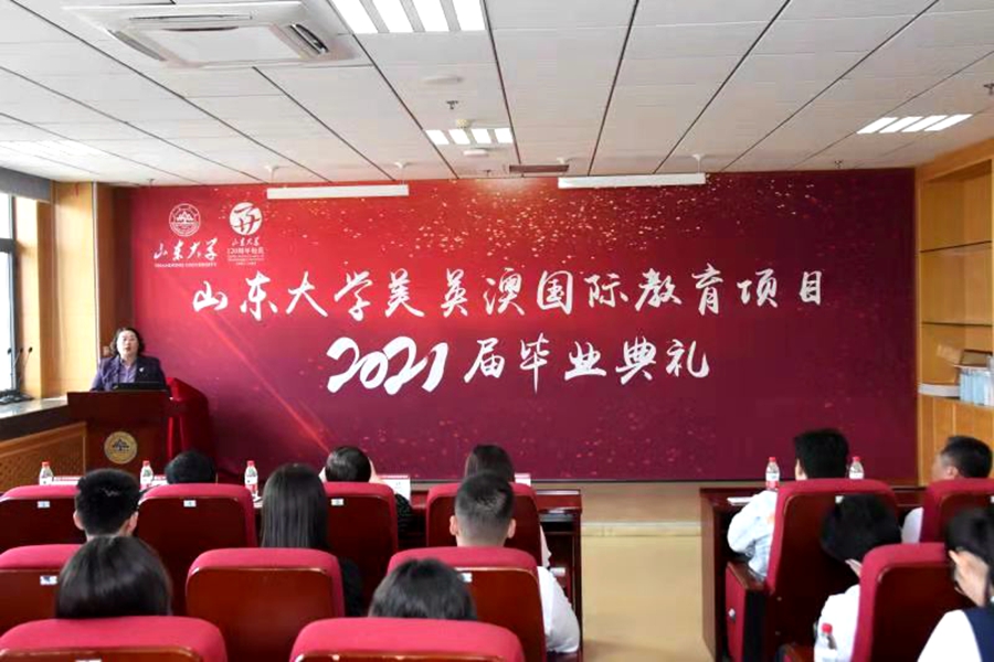 上午9:30,在庄严嘹亮的国歌声中,毕业典礼拉开序幕。周云红首先在典礼上致辞,她对同学们顺利完成山大学业表示祝贺的同时,提出两点希望:一是出国后勤奋学习,把自己培养成为具有国际化视野和创新能力的高素质优秀人才,展示中国形象,传播中国文化;二是将山大人立身养德的坚守、不断创新的追求、胸怀天下的担当融入骨血,去涵养家国天下的情怀,乘风破浪,创造人生的无限可能。王秀丽在致辞中对美英澳2021届毕业生取得的成绩表示祝贺,对辛勤付出的老师表示感谢,她希望同学们做讲诚信、有道德、重责任、懂奉献的合格山大人,传播山大文化,弘扬山大精神,以优异的成绩回报祖国。教师代表曲创鼓励同学门出国后要做到三点:一要勇敢面对挑战;二要坚持战胜困难;三要珍惜青春时光。留学部相关负责人针对海外学习、生活给同学们提出了建议,祝福大家学业顺利。员工代表刘乃嘉回顾了当年在山大的学习生活,感谢母校提供的平台与机会,寄语学弟学妹们怀揣报国理想,自信面对未来。优秀员工代表张书姮表达了对老师的感激之情和对对母校的依依惜别之情,衷心愿母校百廿华诞快乐!周云红和王秀丽分别为优秀毕业生颁发奖学金和毕业纪念品。石绍宾为每位毕业生颁发结业证书并合影留念。