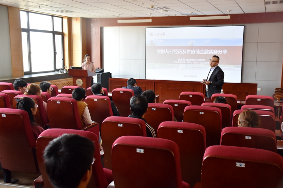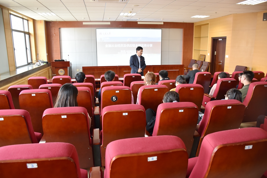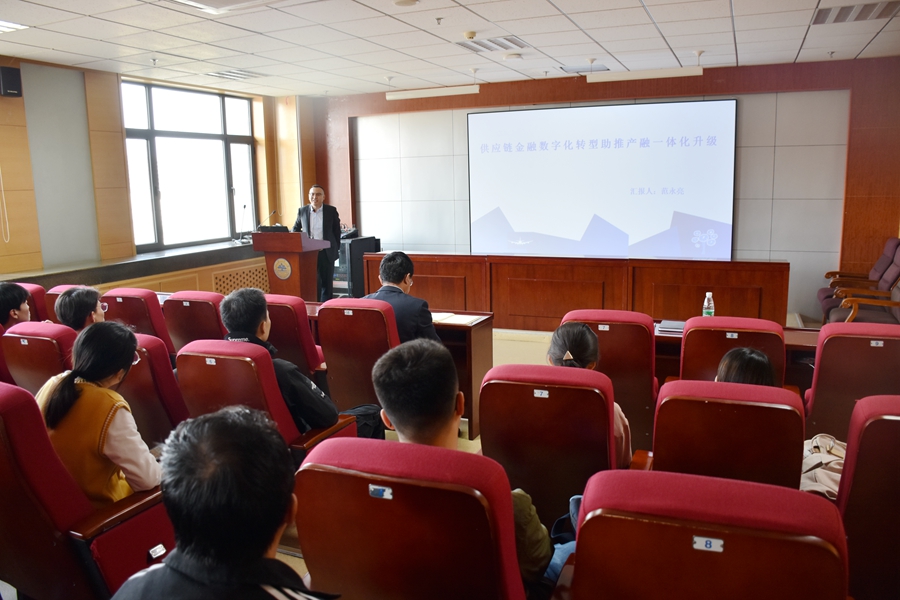 在分享了自己在银行、保险及类金融机构不同的工作经历和感悟之后,范永亮作了题为“供应链金融数字化转型助推产融一体化升级”的讲座。在推动互联网、大数据、人工智能和实体经济深度融合背景下,现代供应链等领域要培育新增长点、形成新动能。报告认为供应链管理是计划、控制和执行从材料到生产再到分销的产品流程的过程管理,达到供应链总成本最优的目标,从而使得资金流、信息流、物流、商流四流合一。为此,企业可以通过线上保理、应付凭证多级流转、资产证券化、供应链贸易来解决应收融资问题。最后,报告指出区块链与供应链的完美组合,可以畅通多层级的信用传递、推动多主体更好地合作协调、进一步化解系统性风险,简化操作流程、降低人工成本、减少出错几率,使得资金提供方通过系统进行线上确认和放权提高审批效率,为供应链金融的良好运行与资产安全高效提供了可靠保障。报告结束后,范永亮就老员工职业规划与就业选择等问题与参会师生进行了交流与探讨。