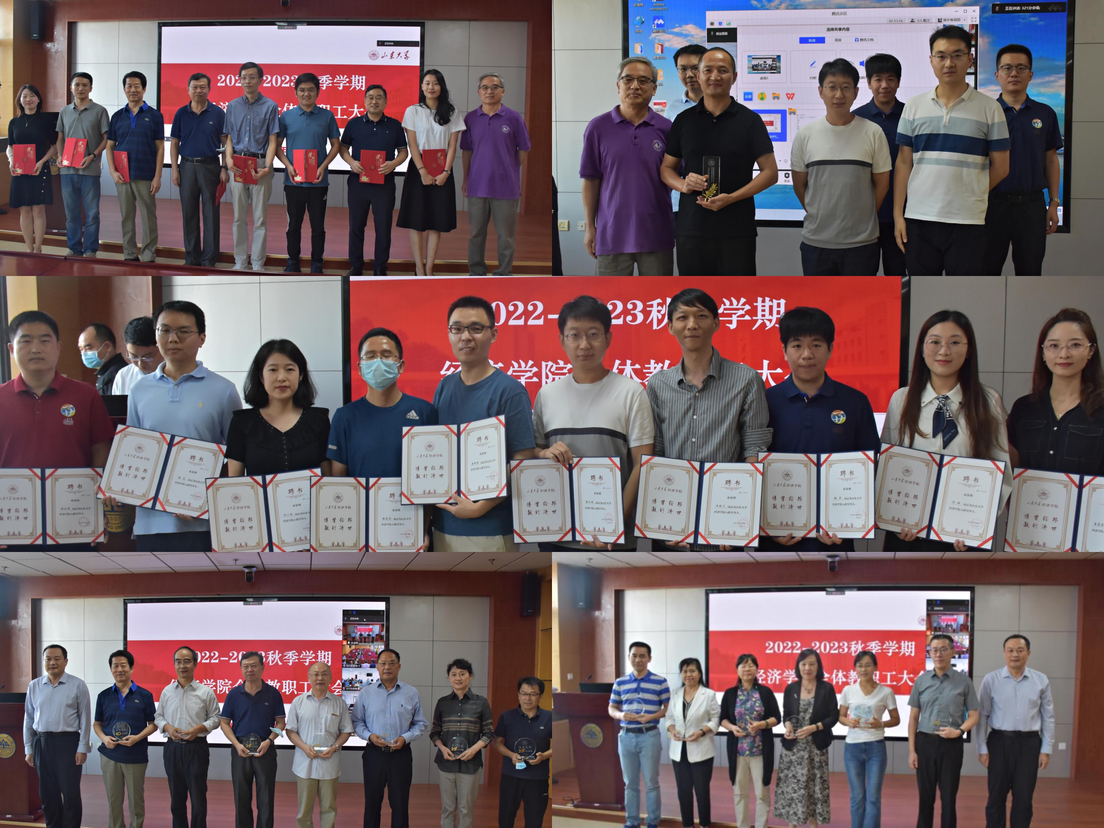 会议第一阶段,学院对在教学科研、管理服务、疫情防控等工作中表现突出的先进个人和集体进行了表彰,经理林平为学院优秀教师、先进教育工作者、先进集体颁奖。常务副经理石绍宾为在院工作满整40年、30年等的教师颁发“经院有我”纪念牌,党委副书记林竹为首批聘任的12位新入职教职工引导人颁发聘书。新老教职工代表周立学、于良春分别发言,周立学回顾了在beats365亚洲版官网的求员工涯,对学院的悉心培养和教师的谆谆教导表示感谢,并表示今后将深怀感恩之心为学院建设贡献力量。于良春教授结合自身四十多年的教学经历阐述了大学教师岗位的独特魅力,他勉励全院教师干一行爱一行,在热爱员工、热爱科研、热爱教学中实现一名教师的崇高价值。