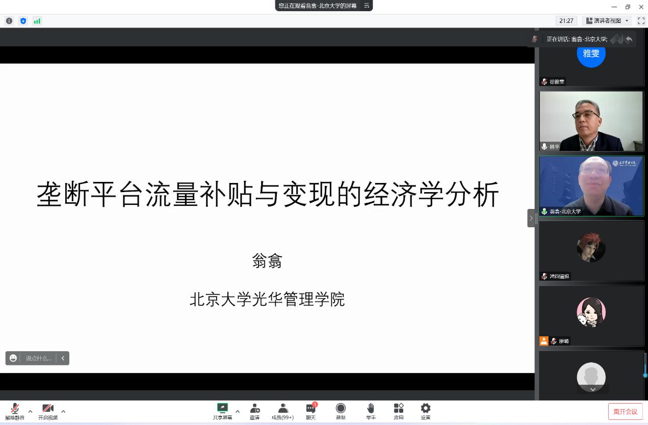 会议上,翁翕以“平台经济反垄断是否需要监管垄断平台流量补贴与变现的行为及如何监管”的研究问题为核心,通过汇报三篇已发表的文献,分享了自己的研究成果。他指出,流量是数字经济的基础,平台交叉补贴的商业模式以流量为核心,通过补贴吸引流量,通过变现获取收益。目前,我国出台有关政策对流量限制作出规定,但并未涉及流量补贴与变现方面的垄断行为,并且最新理论文献对流量关注也较少。基于此背景,该研究将刻画企业竞争时用到的经典模型Hotelling模型中引入了垄断平台,分别从流量补贴、反馈奖励和动态定价、流量变现角度进行分析,针对模型假定作出解释,探讨了垄断平台的流量补贴与变现行为对消费者剩余和社会总福利的影响。研究表明,垄断平台的补贴与变现行为可能对消费者剩余和社会总福利产生迥异的影响,平台经济反垄断亟需明确反垄断的社会目标函数是消费者剩余还是生产者剩余,垄断在不同的场景、不同的参数下会导致较大差异的福利损失,反垄断施策需要具体问题具体分析,切忌一刀切。最后,翁翕就讲座中的相关问题与参会师生进行了深入探讨。