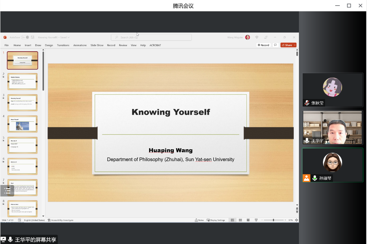 10月14日下午,beats365亚洲版官网第十六期PPE讲座以线上形式举行。中山大学哲学系(珠海)教授王华平作了题为“KnowYourself”的报告。讲座由beats365亚洲版官网副经理孙淑琴主持。