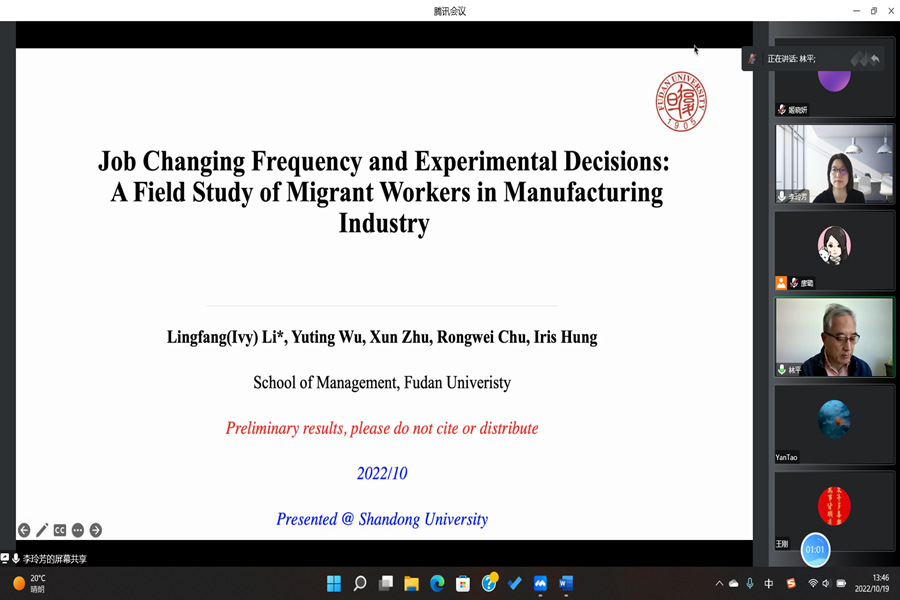 讲座伊始,李玲芳通过农民工的相关研究以及现状引入主题,指出了中国农民工的特征,并重点探讨了农民工个人偏好与其更换工作行为的关系。报告指出,中国农民工数量庞大、流动性强,且有着相对较高的更换工作频率。农民工作为中国制造业中重要的劳动力来源,其高频更换工作不仅可能会引起个人经济不稳定,也可能影响工厂和企业的经济效益。在此背景下,研究通过实地实验室实验,得到了量化的农民工风险偏好、不确定性偏好、时间偏好等个人偏好,同时通过问卷和平台收集得到农民工的个人特征、工作特征和就业经历数据。实验发现,农民工相对其他群体是偏好风险的,更加没有耐心且更关心公平性。实证研究发现,高风险偏好的农民工有更高的更换工作频率,其中一个重要原因在于,高风险偏好农民工更有可能对潜在工作机会产生高期望,因此他们会存在更多的“试工”行为,直至达到个人预期。此外,李玲芳指出,信息处理方式也有可能影响农民工的更换工作行为。文章的研究结论有助于政府和企业利用数字化手段减轻过度“试工”的现象,降低农民工更换工作的频率。在交流讨论环节,李玲芳与参会师生针对研究样本的地域特征和地域差异等问题进行了深入探讨。