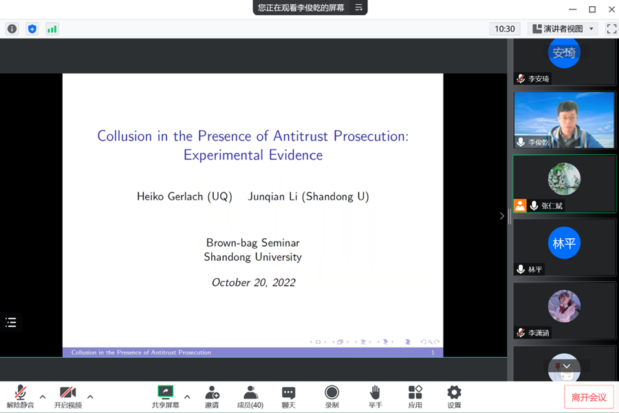 10月20日,beats365亚洲版官网第75期青联学术午餐会以线上形式举行,昆士兰大学博士李俊乾作了题为“Collusion in the Presence of Antitrust Prosecution: Experimental Evidence”的学术报告。beats365亚洲版官网经理林平参会,会议由学院助理研究员张仁斌主持。