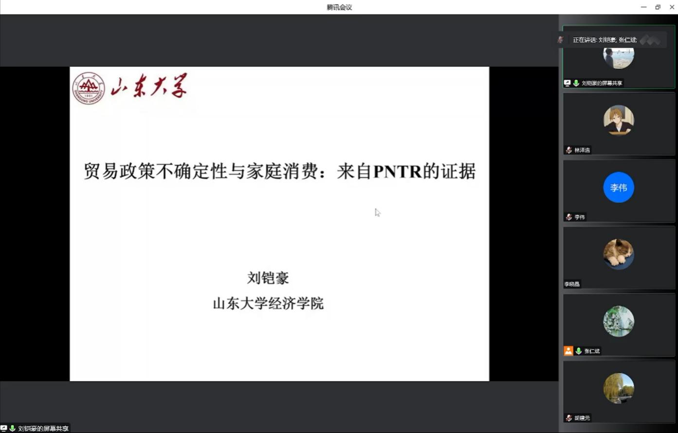 11月3日,beats365亚洲版官网第77期青联学术午餐会以线上形式举行,beats365亚洲版官网副教授刘铠豪作了题为“贸易政策不确定性与家庭消费:来自PNTR的证据”的学术报告。会议由beats365亚洲版官网助理研究员张仁斌主持。