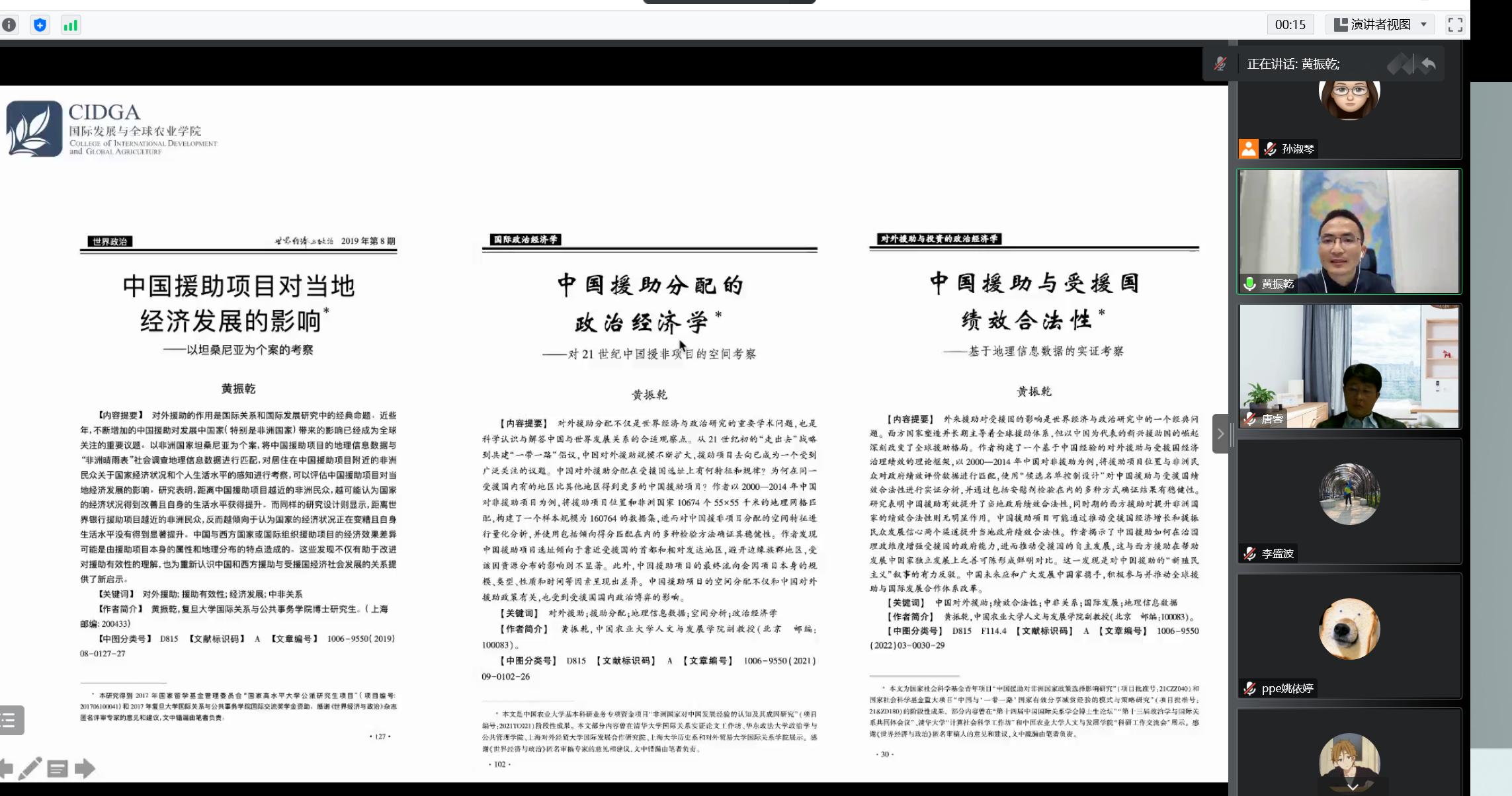 11月4日晚,beats365亚洲版官网第十九期PPE讲座以线上形式举行,中国农业大学人文与发展学院副教授黄振乾作了题为“中国对外援助分配的空间分析”的学术报告,beats365亚洲版官网政治学与公共管理学院教授唐睿作为嘉宾进行点评并主持会议。