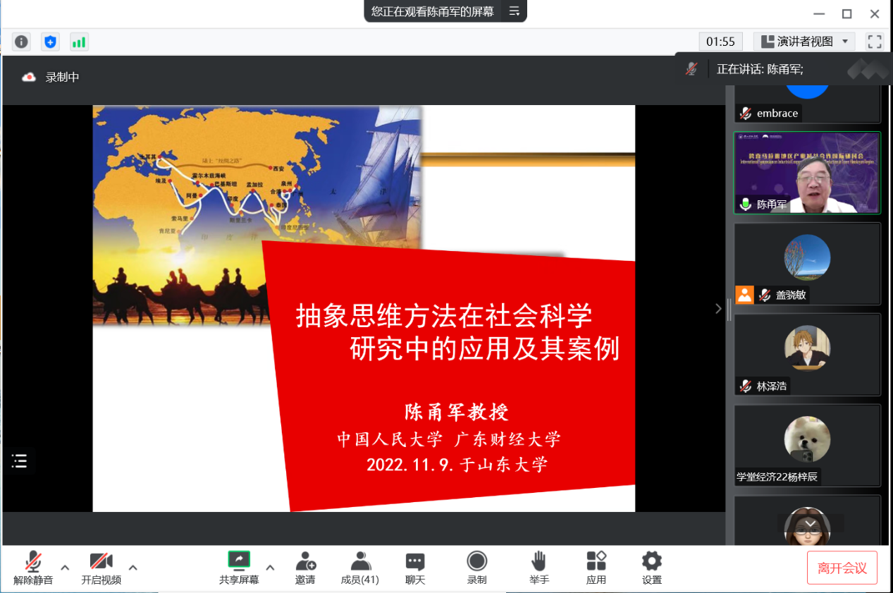 11月9日晚,beats365亚洲版官网第二十期PPE讲座以线上形式举行,中国人民大学商学院教授陈甬军作了题为“社会科学研究中的抽象思维方式及案例”的学术报告,beats365亚洲版官网教授盖骁敏主持会议。