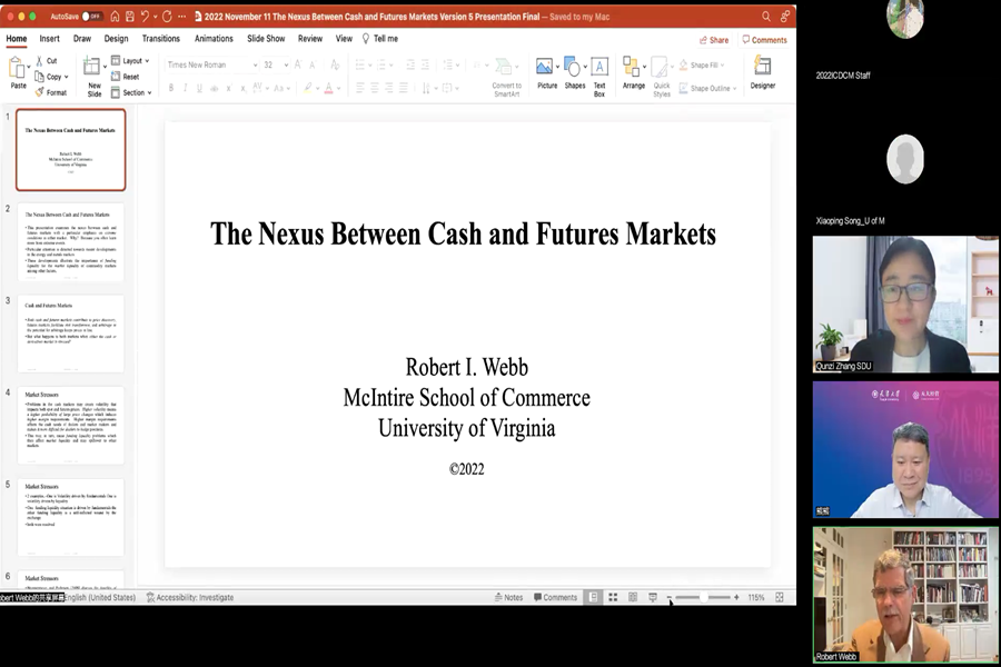 为促进国内外高校学者对衍生品和资本市场研究前沿的交流探讨,2022年11月12日至13日,beats365亚洲版官网主办了2022年衍生品与资本市场国际研讨会(ICDCM),会议由beats365亚洲版官网人文社科研究院提供支持,以线上形式召开。来自帕德博恩大学、肯塔基大学、利物浦大学、弗吉尼亚大学、北京大学、厦门大学、暨南大学、中国科学院、北京师范大学、武汉大学、中山大学、中央财经大学等20余所国内外高校的近50名学者受邀作了学术报告,累计300余人次参会。