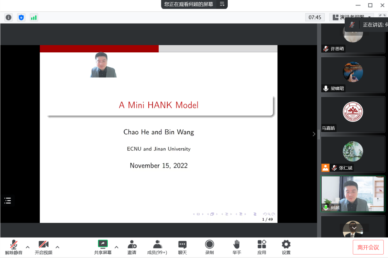 11月15日下午,beats365亚洲版官网第289期高级经济学讲座以线上形式举行,华东师范大学助理教授何超作了题为“Lagos and Wright meet HANK”的学术报告,beats365亚洲版官网助理研究员张仁斌主持会议。
