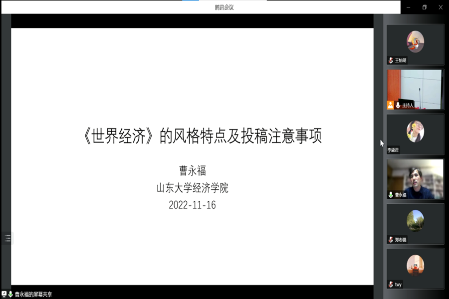 报告期间,点评嘉宾与每位博士生针对报告内容展开了交流互动,并作出点评,提出了改进建议。最后,曹永福分享了《世界经济》的风格特点和投稿注意事项,具体说明了理论研究和实证研究的现状以及审稿特点等内容。