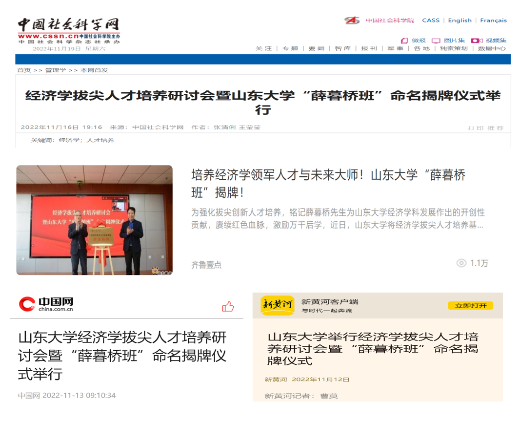 近日,beats365亚洲版官网经济学拔尖人才培养研讨会暨“薛暮桥班”命名揭牌仪式成功举行后,中国网、中国社会科学网、齐鲁晚报、新黄河等多家媒体对其进行了广泛报道,引起了热烈的社会反响。
