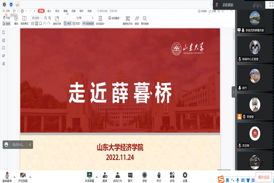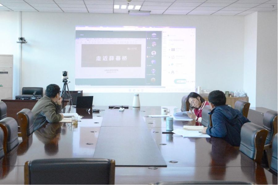 经理林平指出,讲述薛暮桥故事、展示薛暮桥事迹、传承薛暮桥精神是学院深入贯彻落实党的二十大精神、推动落实学校文化引领战略的重要举措。我们要进一步全面挖掘薛暮桥先生的生平事迹,通过开展实地探看、馆藏调研、相关人物寻访等进一步搜集丰富历史资料;要进一步挖掘薛暮桥先生的经济学思想精髓,结合经济思想史研究等积极组织动员学院科研力量,从现代经济学角度出发,丰富薛暮桥经济思想研究成果;要充分发挥“薛暮桥”文化品牌的学术价值,聚焦经济领域的重大理论和实践问题,结合学科特色,将关于薛暮桥先生的研究计划与谋划各类重大科研项目相结合,与智库建设及服务山东工作相结合,全方位、立体式地走近薛暮桥。