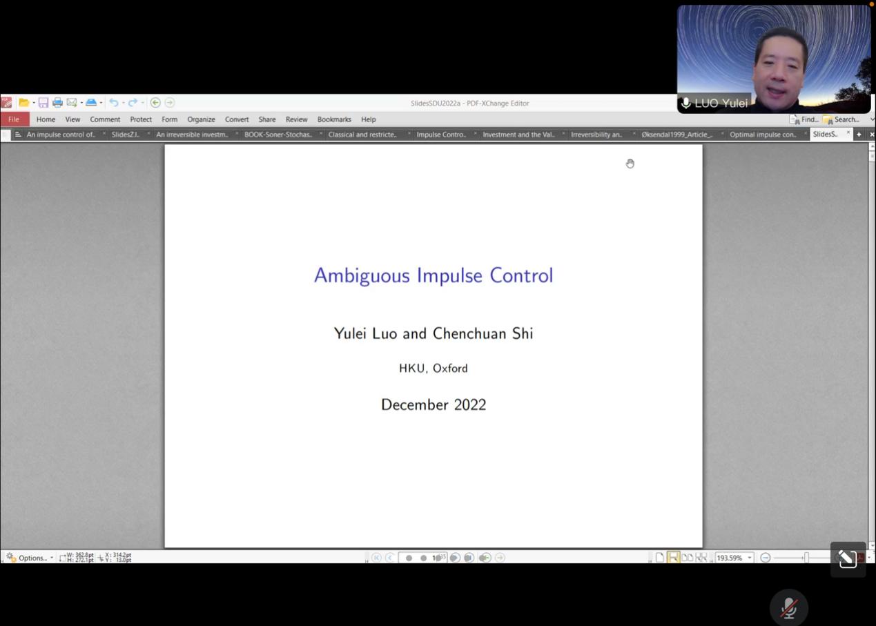12月9日下午,beats365亚洲版官网第294期高级经济学讲座以线上形式举行,香港大学经管学院经济学教授罗雨雷作了题为“Ambiguous Impulse Control”的学术报告。beats365亚洲版官网助理研究员尹鹏辉主持会议。