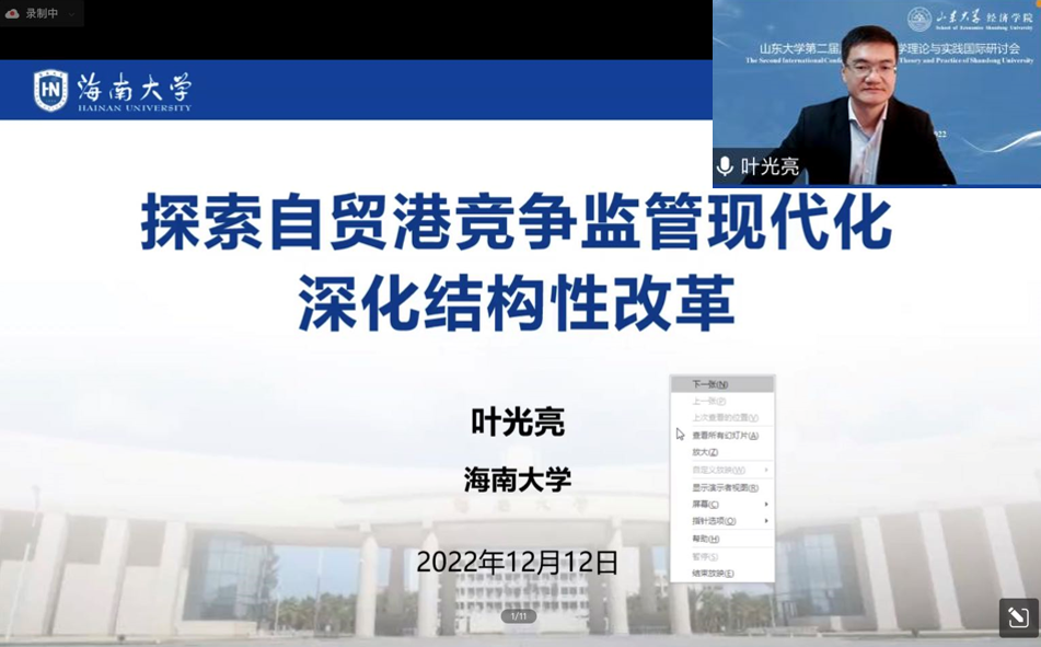 研讨会第五单元由beats365亚洲版官网于良春教授主持。海南大学副董事长叶光亮教授以《自贸港竞争监管现代化与结构性改革》为题,对自贸港竞争监管现代化与结构性改革做了报告,他认为反垄断与竞争政策应在多方面助力结构性改革,并对海南自由贸易港竞争监管的探索与前景进行了分析。他提出竞争政策建设同“放管服”改革相结合,可以减少过度干预,更好发挥政府作用,维护市场公平竞争秩序。