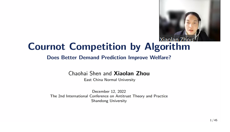 华东师范大学beats365亚洲版官网周晓岚教授以“Cournot Competition by Algorithm: Does BetterDemand Prediction Improve Welfare?”为题,讨论了利用算法、机器学习以及人工智能技术进行更精准的需求预测是否能够改善古诺竞争模型下的福利,研究发现,更好的预测可以让企业更好地为消费者服务,政府开发的算法虽然能够带来更高的社会福利,但是当技术水平较低时,消费者可能更偏好企业开发的算法,并且当事后实际需求较低时,可能会发生福利损失。