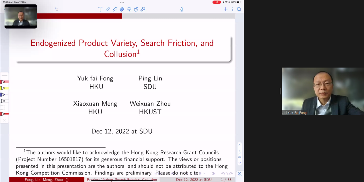 香港大学经管学院副经理房育辉教授以“Product Variety and Collusion”为题,分析了在具有内生、纵向差异化产品种类和多维消费者异质性的伯川德双寡头下产品种类和合谋之间的关系。他指出,研究发现,在许多情况下,当企业只提供高质量的产品时,比企业同时提供高质量产品和低质量产品时串通更容易。同时,还讨论了强制向消费者提供低质量产品的福利影响。