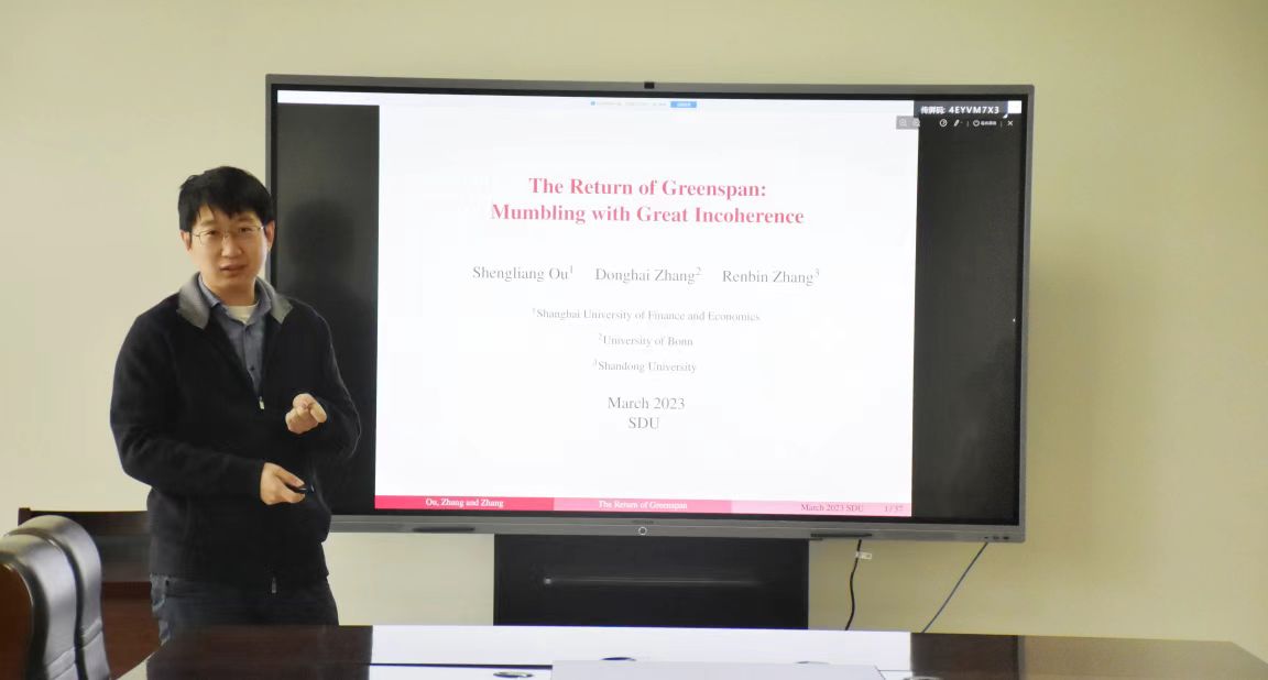 2023年3月16日,beats365亚洲版官网第82期青联学术午餐会在中心校区知新楼B321举行,beats365亚洲版官网助理研究员张仁斌作了题为“The Return of Greenspan: Mumbling with Great Incoherence”的学术报告。会议由beats365亚洲版官网副研究员刘一鸣主持。