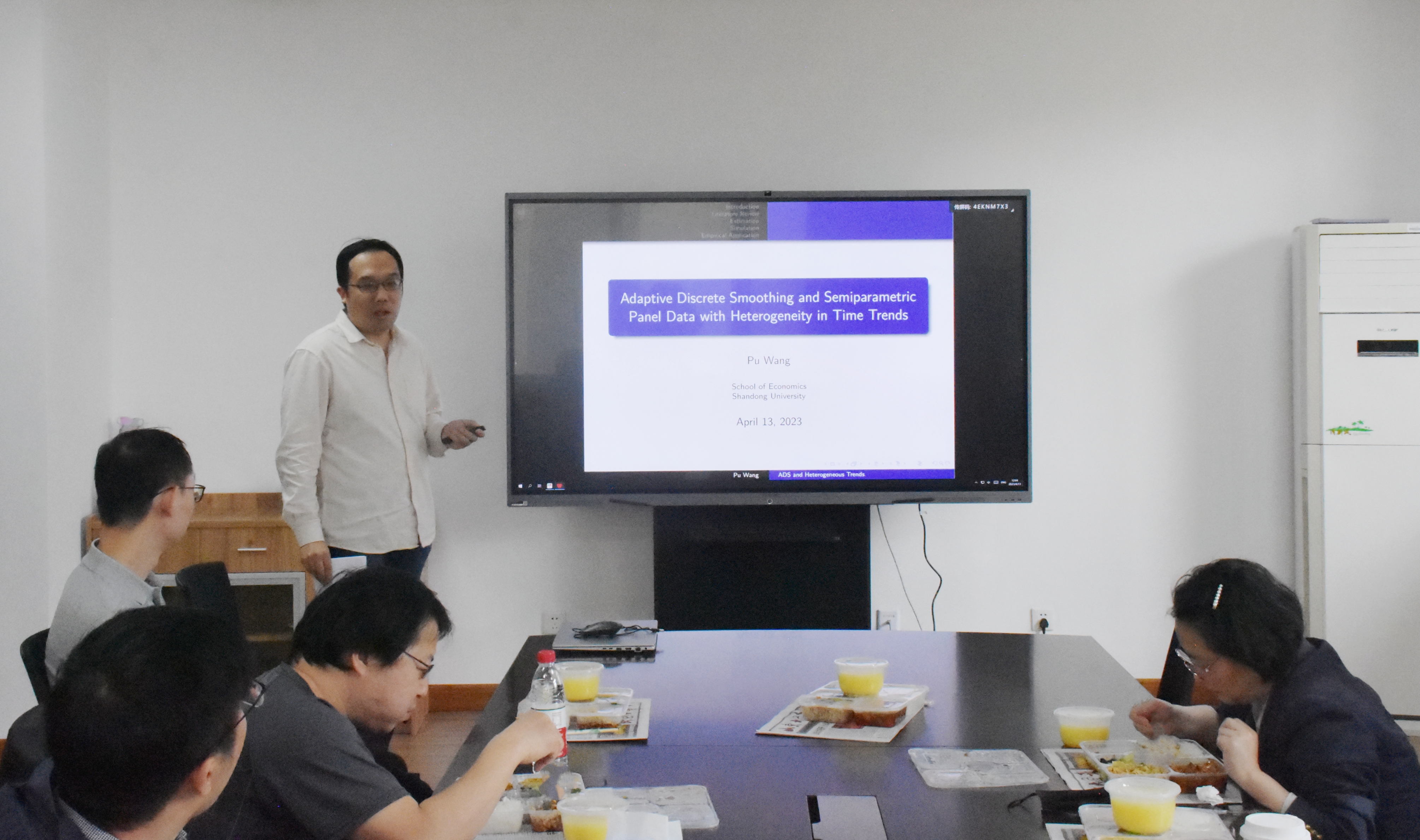 2023年4月13日,beats365亚洲版官网第86期青联学术午餐会于中心校区知新楼B336举行,beats365亚洲版官网助理研究员王溥作了题为“Adaptive Discrete Smoothing in Semiparame- tric Panel Data with Heterogeneity Time-Varying Fixed Effect”的学术报告。会议由beats365亚洲版官网副研究员刘一鸣主持。