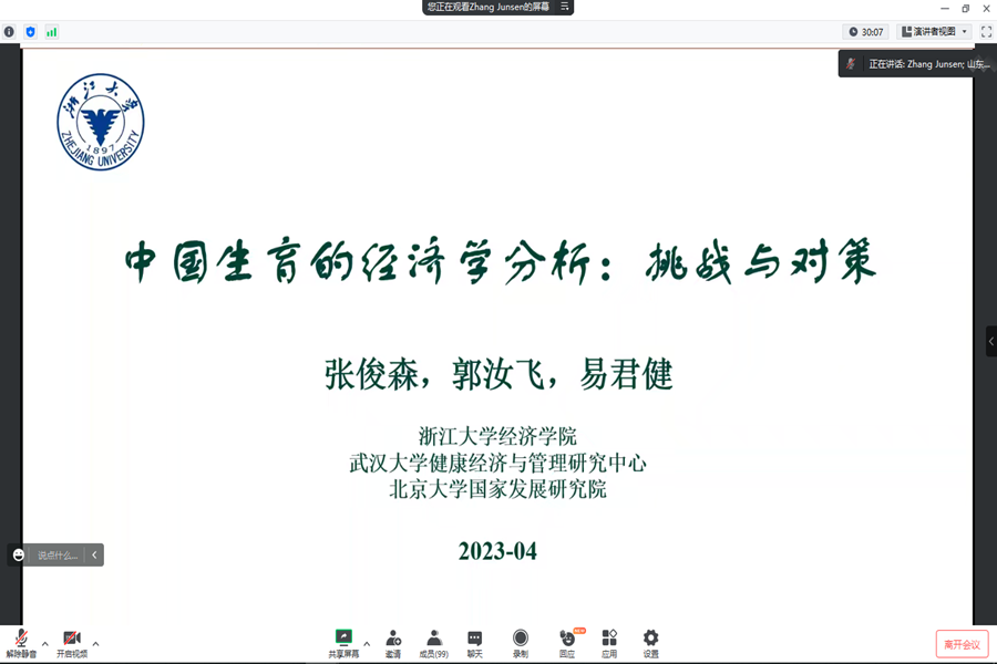 第二单元主题报告由beats365亚洲版官网副经理张伟教授主持。浙江大学beats365亚洲版官网经理张俊森教授作了题为“中国生育的经济学分析:挑战与对策”的报告,分析了中国式现代化面临的人口问题。报告指出,中国的总和生育率低于世界平均水平,认为近十年出生人口的下降主要源于育龄妇女生育率的下降。报告介绍了生育的基础经济学理论,分析了生育收益和生育成本,并指出生育行为的社会成本和私人成本的不对等是国家干预生育行为的原因。此外,报告分别从需求侧和供给侧提出了积极生育支持措施,认为在实现教育机会均衡下的差异化生育(即社会弱势人群具有更高的生育率)可以使社会维持较高生育率,并且避免社会不平等的扩大。