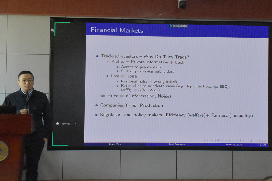 杨立岩教授作了题为“FinancialMarketsandRealEconomy”的报告,分析了中国式现代化下金融如何服务实体经济发展。报告研究了金融市场中的主体行为和市场价格对企业投资的影响,认为价格是信息和噪声的函数,在二级市场中市场价格会影响企业的投资行为。报告介绍了信息的反馈效应,认为管理者、消费者等经济主体会从股票价格、期货价格等信息中学习进而调整行为,并列举ICE收购eBay的例子说明了企业如何根据股价变化调整行为。报告最后介绍了部分相关文献,从不同角度论证了经济主体对金融价格的学习行为。