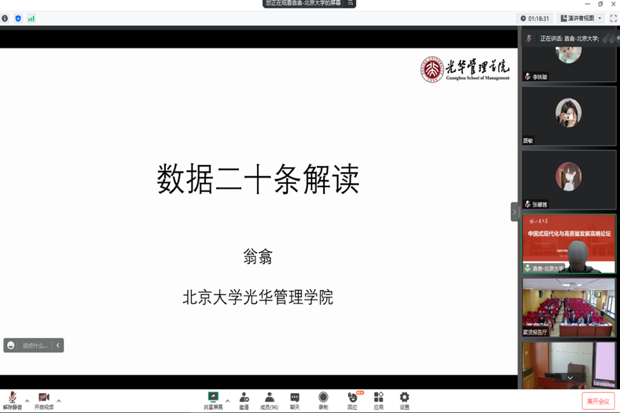 北京大学光华管理学院翁翕教授作了题为“数据二十条解读”的报告。报告首先介绍了数据流动模型,其中消费者提供原始数据,机器负责对数据进行开发加工和建模分析,商户利用分析后的数据提供个性化服务,平台通过个性化服务吸引新的流量,又进一步推动消费者产生新的原始数据。随后,报告指出,流量是数字经济的基础,数据是数字经济的核心,创新是数字经济的驱动力,而个性化服务是数字经济的抓手。报告还介绍了数据二十条中数据的所有权、加工使用权以及产权经营权“三权分置”问题,淡化数据所有权问题,强调使用权和用益权。最后,报告认为要以做大数据蛋糕为核心,守住底线,充分调动地方政府积极性,解决数据孤岛问题和数据闲置问题。