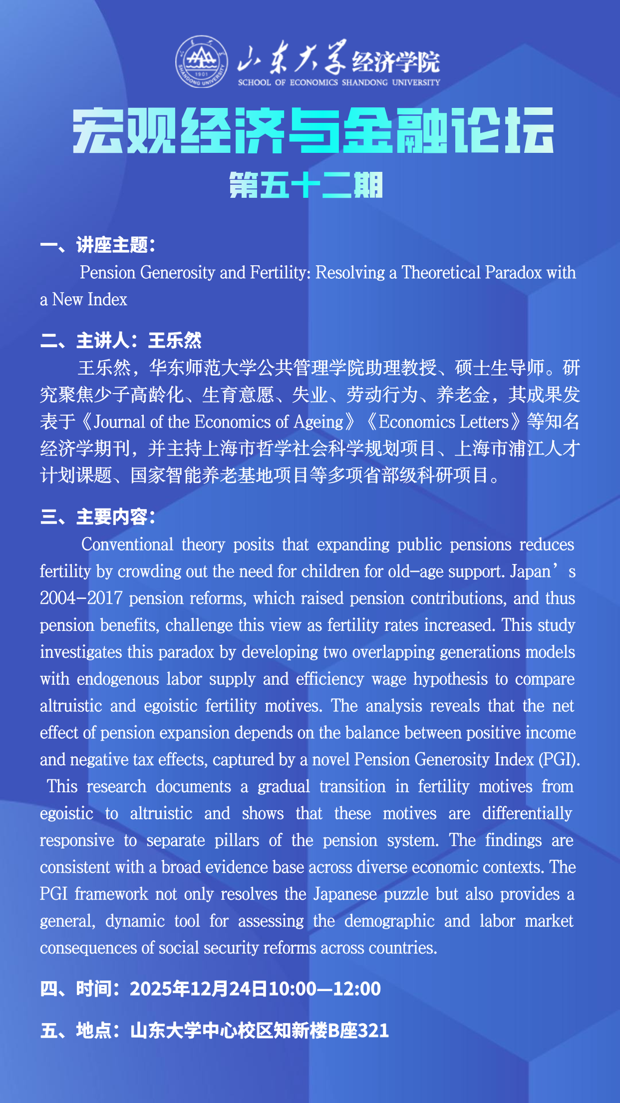 Pension Generosity and Fertility: Resolving a Theoretical Paradox with a New Index(宏观经济与金融论坛第五十二期)