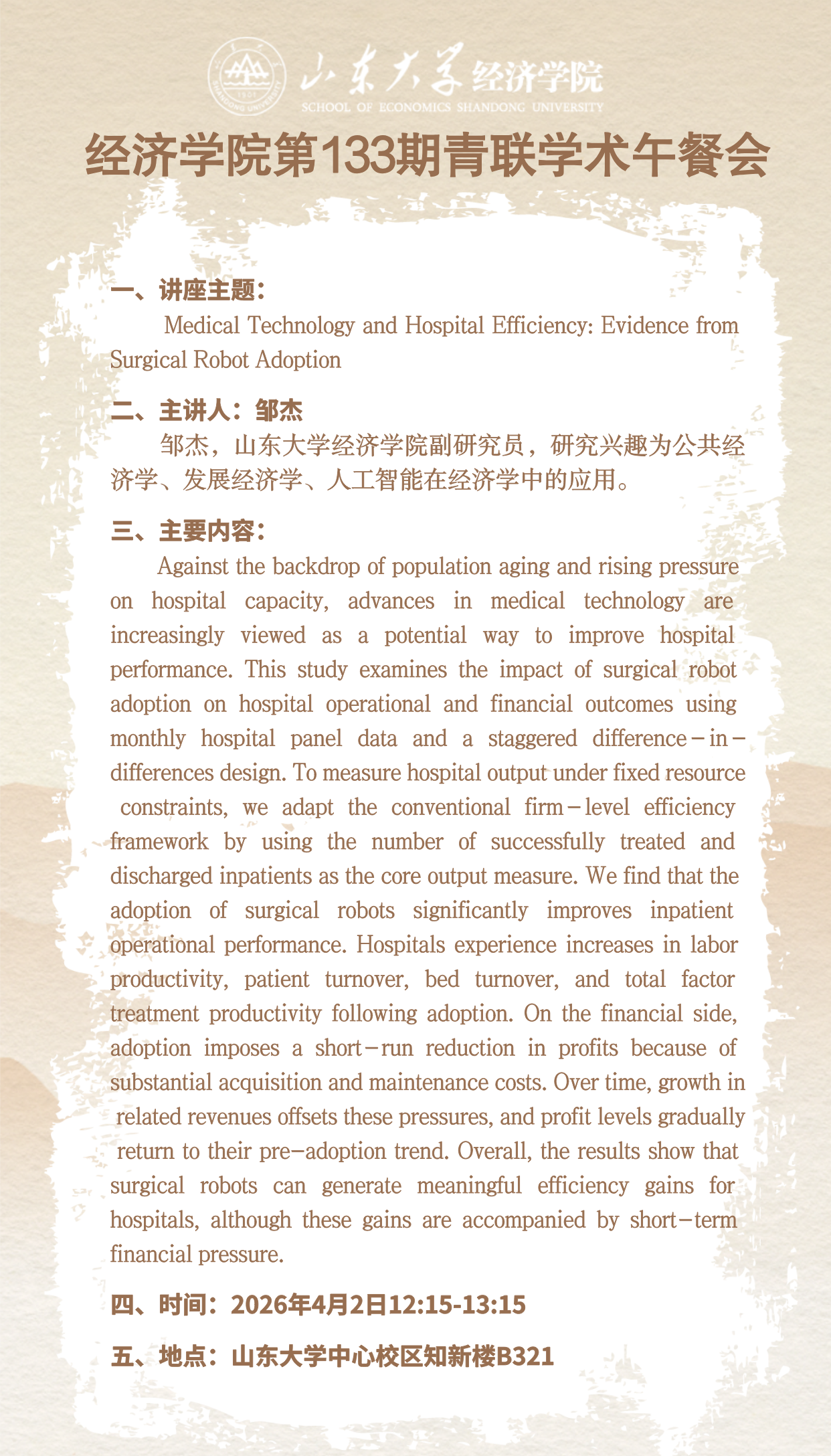 Medical Technology and Hospital Efficiency: Evidence from Surgical Robot Adoption(beats365亚洲版官网第133期青联学术午餐会)