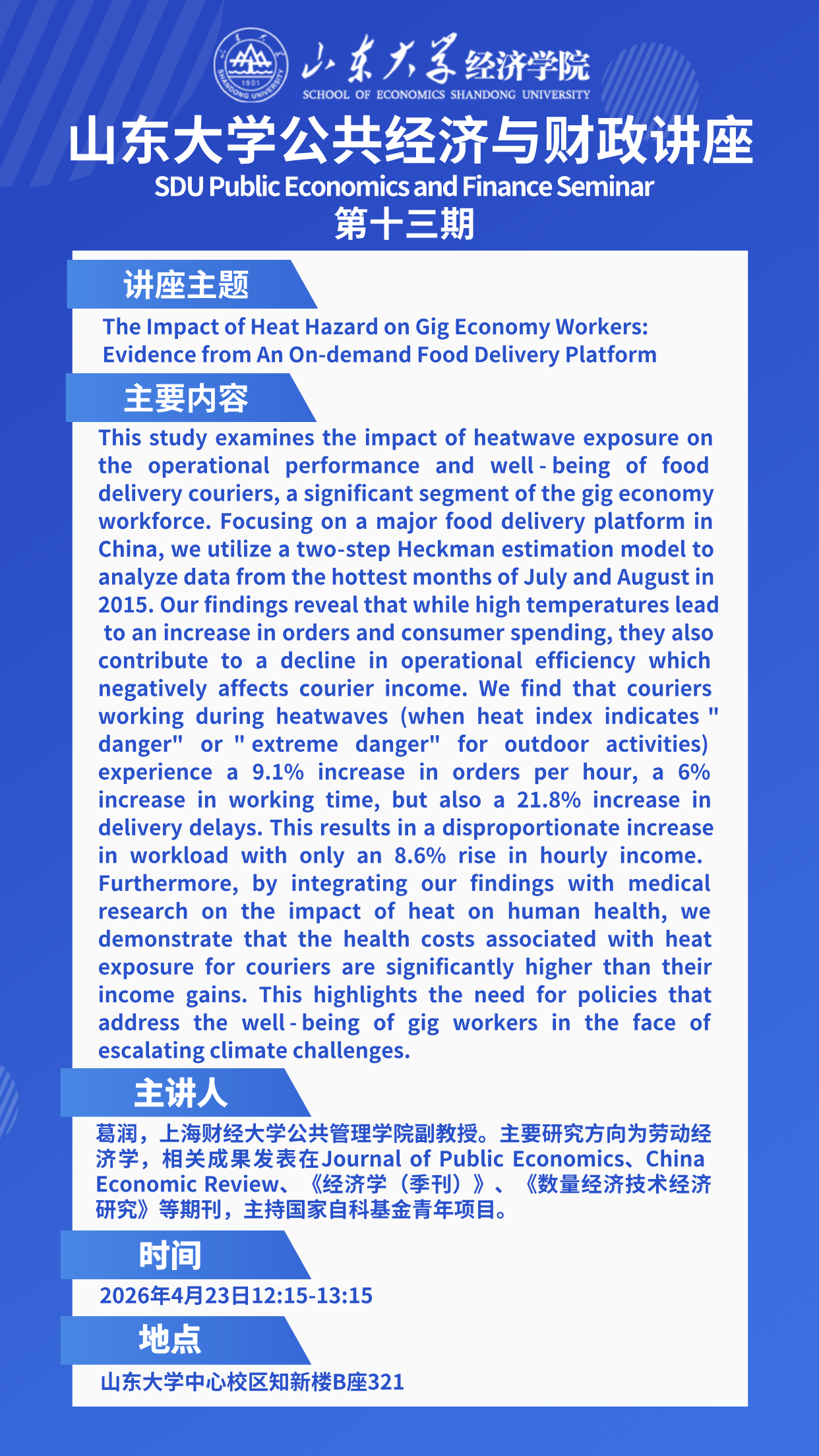 The Impact of Heat Hazard on Gig Economy Workers: Evidence from An On-demand Food Delivery Platform(beats365亚洲版官网公共经济与财政讲座第十三期)