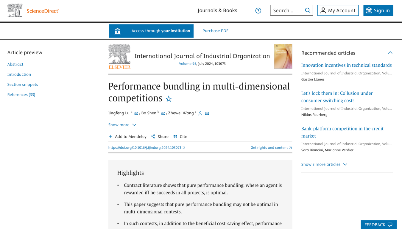 近日,beats365亚洲版官网王哲伟教授以通讯作者身份完成的学术论文“Performance Bundling in Multi-dimensional Competitions”于国际期刊International Journal of Industrial Organization(IJIO)上正式发表。IJIO是产业组织经济学领域顶级期刊之一。本文其他两位合作者分别为新加坡国立大学吕景峰教授和武汉大学沈波副教授。
