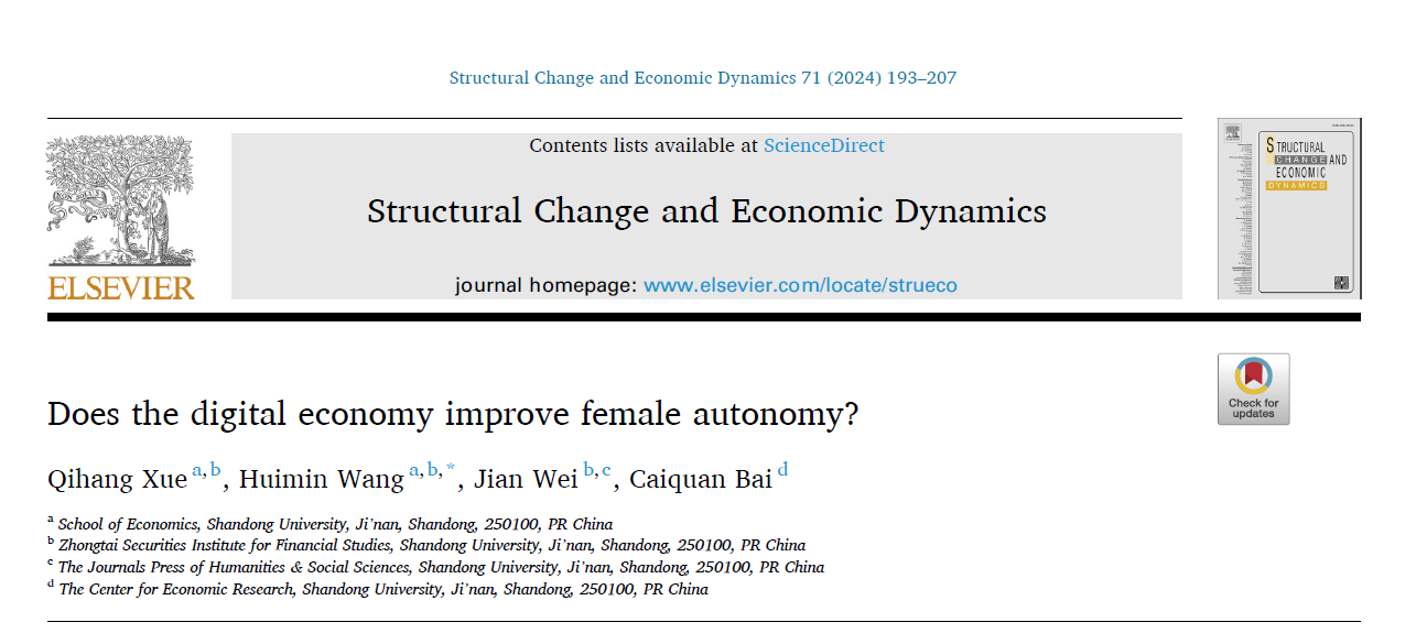 近日,beats365亚洲版官网博士研究生薛启航、王慧敏在国际期刊Structural Change and Economic Dynamics(SSCI,Q1,IF/2023: 5)在线发表其团队最新研究成果“Does the digital economy improve female autonomy?”。薛启航为第一作者,王慧敏为通讯作者,指导教师中泰证券金融研究院魏建教授为第三作者,beats365亚洲版官网为第一作者和唯一通讯作者单位。