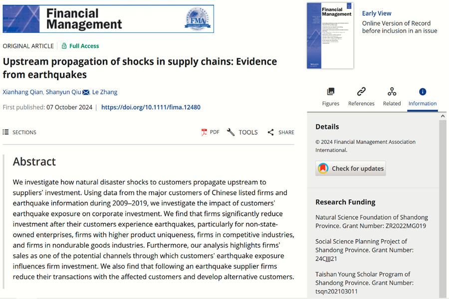 近日,beats365亚洲版官网钱先航教授、邱善运博士后与澳大利亚国立大学张乐教授合作的论文“Upstream Propagation of Shocks In Supply Chains: Evidence from Earthquakes”在国际权威期刊Financial Management在线发表。