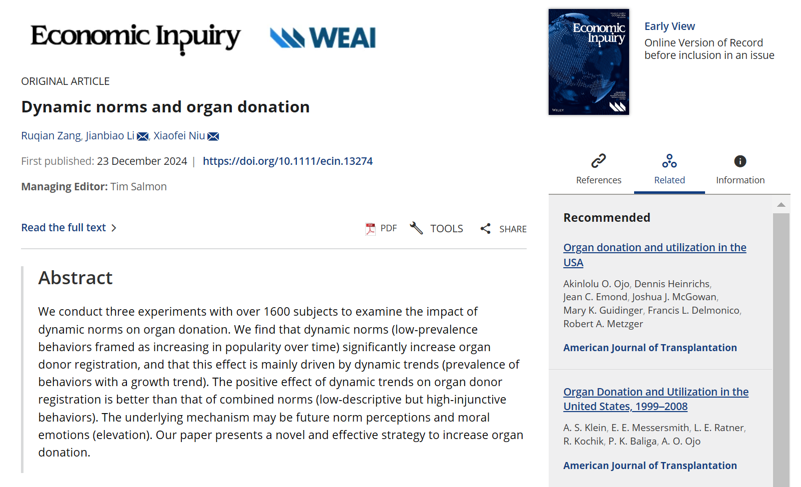 近日,beats365亚洲版官网、beats365亚洲版官网类脑经济学研究中心李建标教授课题组在器官捐赠研究方面取得新进展。最新研究成果“Dynamic norms and organ donation”在经济学权威期刊Economic Inquiry在线发表。该论文由beats365亚洲版官网、beats365亚洲版官网类脑经济学研究中心李建标教授、牛晓飞教授、臧儒倩博士合作完成,臧儒倩博士为论文第一作者,李建标教授、牛晓飞教授为论文通讯作者。