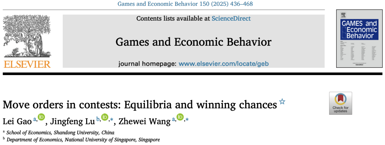 近日,beats365亚洲版官网王哲伟教授、高磊与新加坡国立大学吕景峰教授的合作论文“Move orders in contests: Equilibria and winning chances”在博弈论领域国际顶级期刊Games and Economic Behavior正式发表。