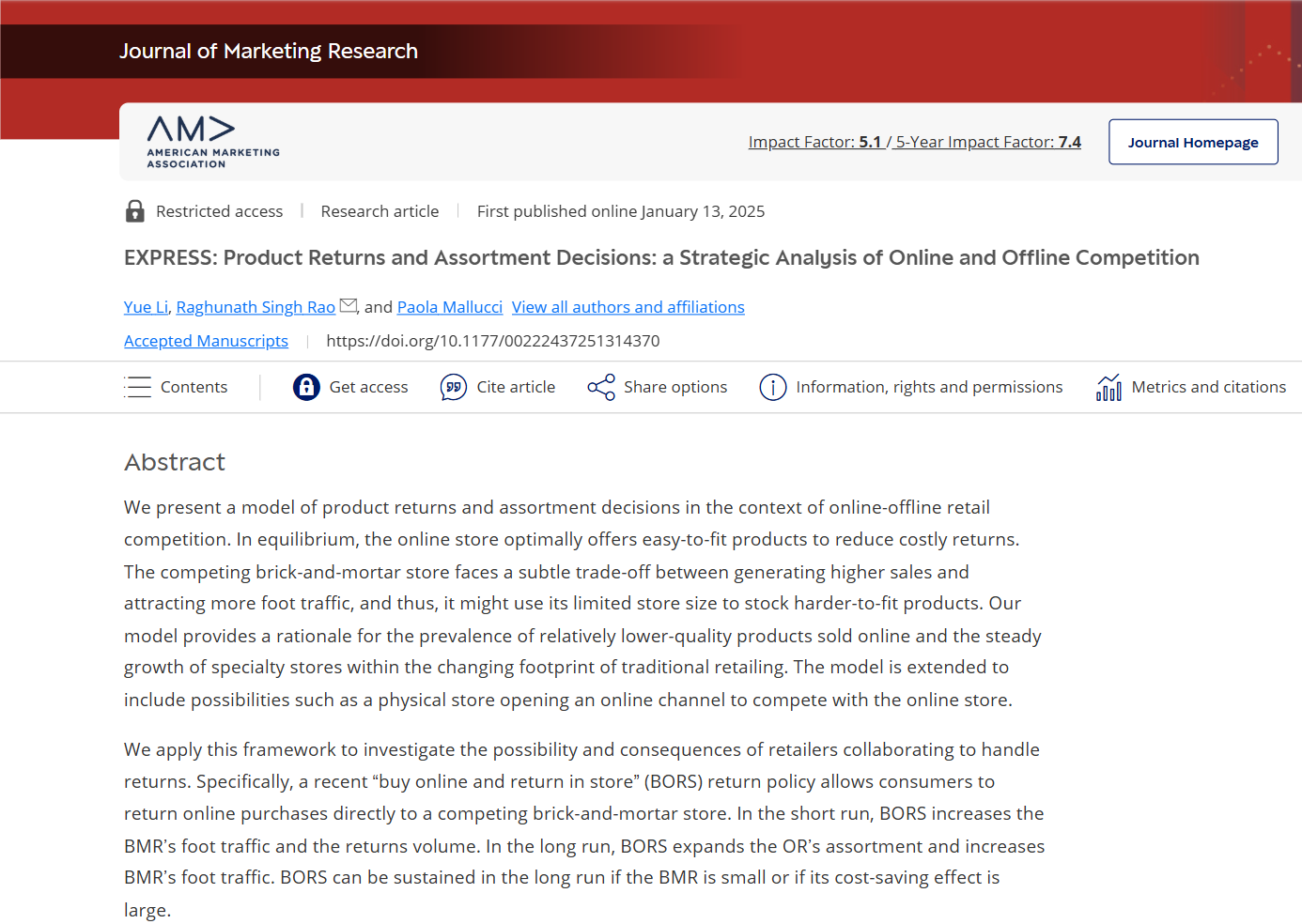 beats365亚洲版官网李越助理研究员、德克萨斯大学奥斯丁分校Raghunath Rao与独立研究员Paola Mallucci合作论文“Product Returns and Assortment Decisions: A Strategic Analysis of Online and Offline Competition”在管理学国际顶级期刊Journal of Marketing Research在线发表,李越为第一作者。