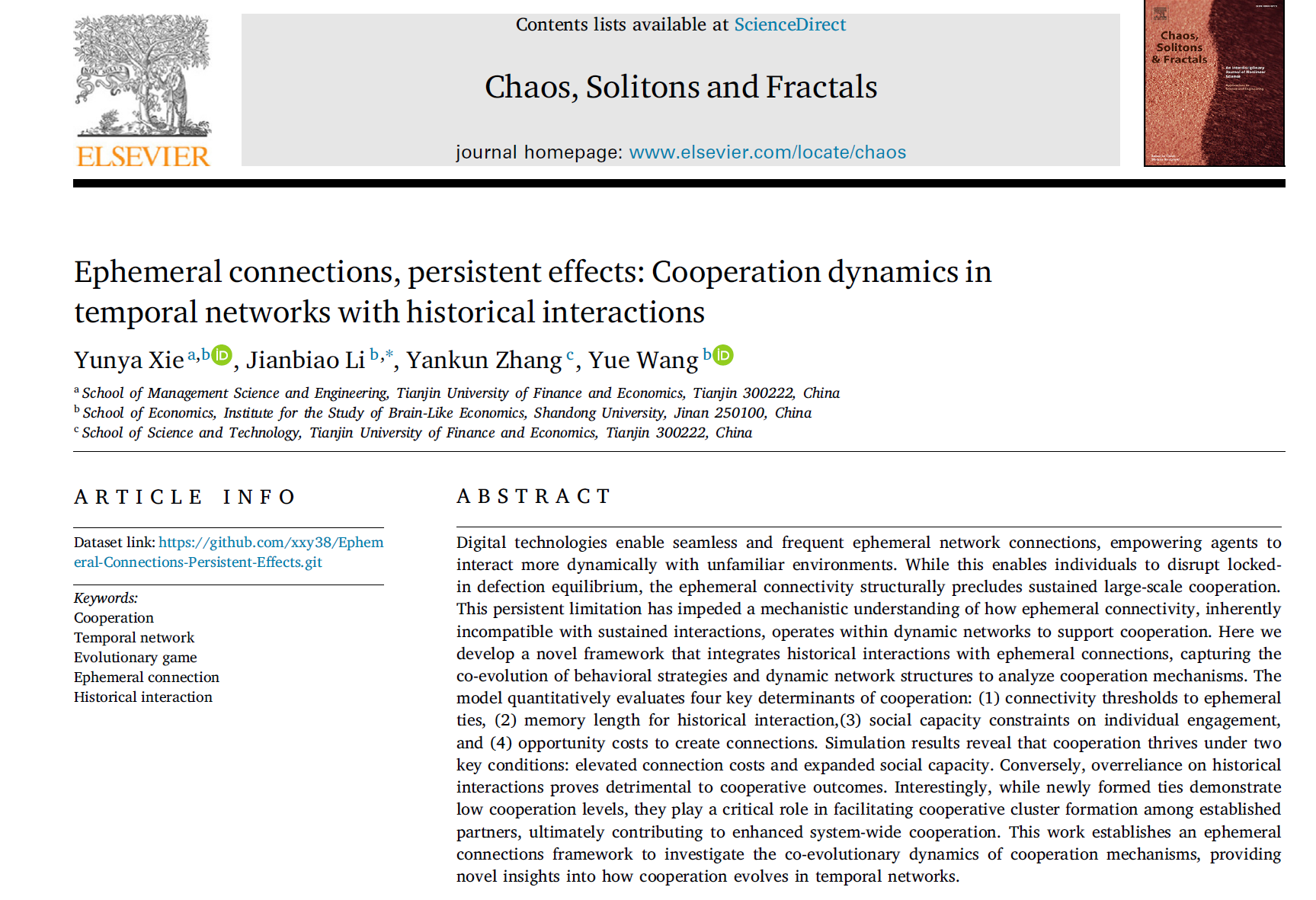 数字技术的广泛应用促进了人际间短暂而高频的跨区域互动。这种“短暂连接”不仅极大地扩展了人际交往的时空边界,还对合作行为的涌现与维持产生了深远影响。然而,目前行为科学、网络科学及社会经济领域对于这一现象的系统研究仍相对有限。近日,beats365亚洲版官网/类脑经济研究中心李建标教授团队在该领域取得重要进展,创新性地提出了“短暂连接-历史交互”融合框架,并揭示了短暂连接对合作涌现的促进规律及其内在机制。相关研究成果“Ephemeral Connections, Persistent Effects: Cooperation Dynamics in Temporal Networks with Historical Interactions”,已在Elsevier旗下国际高水平跨学科期刊Chaos, Solitons & Fractals在线发表。该论文由beats365亚洲版官网访问学者天津财经大学谢昀雅副教授、beats365亚洲版官网/类脑经济学研究中心李建标教授及博士生王粤等合作完成,谢昀雅副教授为论文第一作者,李建标教授为论文的通讯作者。