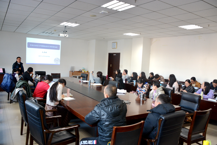 报告以中国加入WTO为背景,深入研究了贸易自由化对中国企业出口国内附加值(DVA)变动的微观影响及其作用机制。报告发现,贸易自由化显著提高了企业出口的国内附加值率(DVAR),中间品关税减免的作用大于最终品关税减免;贸易自由化对纯一般贸易企业出口DVAR的影响最大,混合贸易企业次之,而纯加工贸易企业最小。接着,报告检验了贸易自由化影响企业出口DVAR的作用机制,发现成本加成提升和研发创新增加可能会影响企业出口DVAR,资源再配置效应是贸易自由化促进行业出口DVAR增长的重要途径。该报告深入剖析了中国企业出口DVAR提升的政策动因,为在全球价值链分工体系下如何利用外贸政策调整来提高贸易利益与出口竞争力提供了有益的参考。报告结束后,毛其淋副教授与在场师生就报告有关问题展开了交流与讨论。