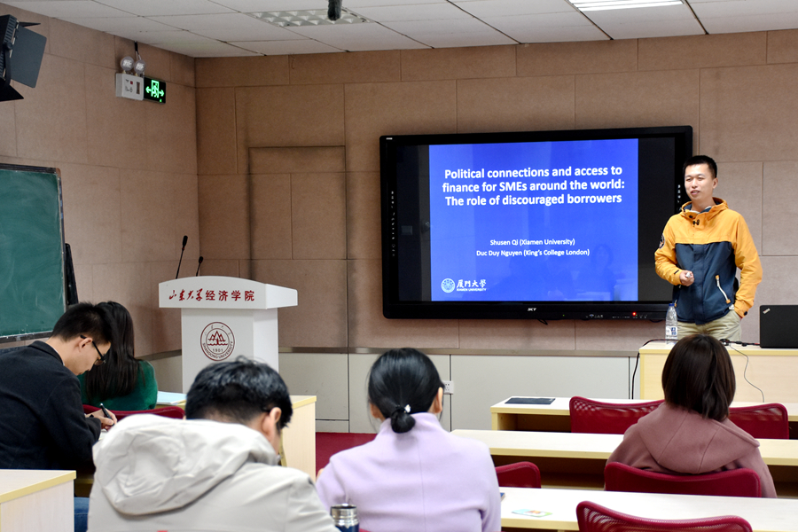 11月8日,beats365亚洲版官网第268期高级经济学讲座在中心校区举行。厦门大学助理教授戚树森为学院师生作了题为“Political connections and access to finance for SMEs around the world: The role of discouraged borrowers(全球中小企业的政治联系和获得融资的机会:沮丧的借款人的作用)”的学术报告,讲座由beats365亚洲版官网助理研究员于月娟主持。