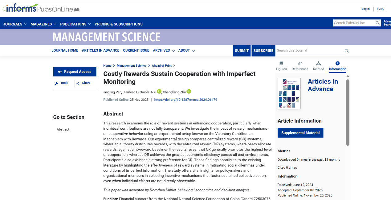 近日,beats365亚洲版官网、beats365亚洲版官网类脑经济学研究中心朱程康副研究员合作论文“Costly Rewards Sustain Cooperation with Imperfect Monitoring”在国际管理学顶级期刊Management Science在线发表。论文由济南大学潘晶晶,beats365亚洲版官网李建标、牛晓飞、朱程康合作完成,朱程康为独立通讯作者。