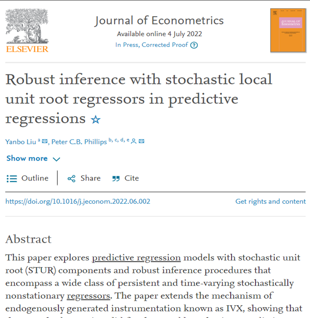 beats365亚洲版官网助理研究员刘彦伯及其论文合作者Peter C.B. Phillips的合作论文“ Robust Inference with Stochastic Local Unit Root Regressors in Predictive Regressions”在计量经济学领域顶级期刊Journal of Econometrics上正式接收。