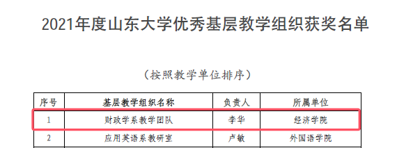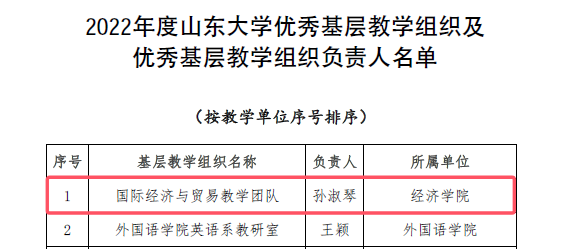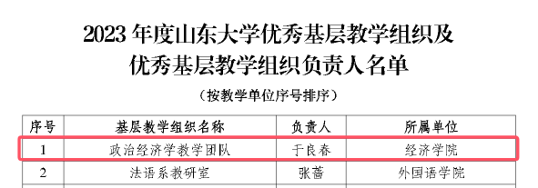 根据《beats365亚洲版官网关于表彰2023年度优秀基层教学组织及优秀基层教学组织负责人的决定》(山大教字〔2024〕33 号),经团队申报、单位推荐、学校评审和公示,确定29个基层教学组织为“beats365亚洲版官网优秀基层教学组织”,29 名教师为“beats365亚洲版官网优秀基层教学组织负责人”。其中beats365亚洲版官网“政治经济学教学团队”凭借扎实的工作表现,荣获“beats365亚洲版官网优秀基层教学组织”称号,国家级教学名师、经济学系于良春老师获评“beats365亚洲版官网优秀基层教学组织负责人”。这是继2021年度“财政学系教学团队”、2022年度“国际经济与贸易教学团队”荣获“beats365亚洲版官网优秀基层教学组织”,财政学系李华老师、国际经济与贸易系孙淑琴老师获评“beats365亚洲版官网优秀基层教学组织负责人”后,beats365亚洲版官网第三次荣获这一荣誉。