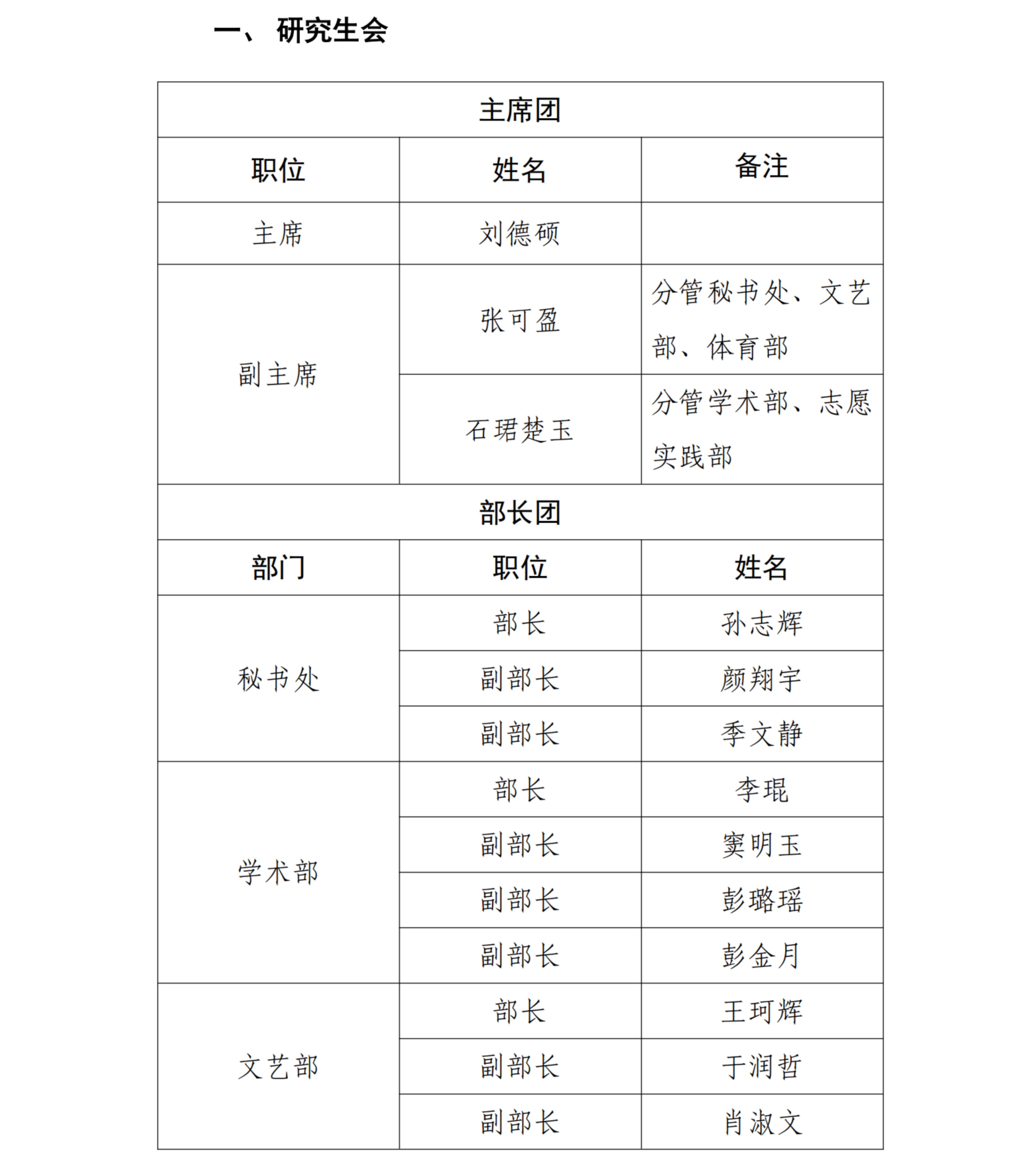 经过个人申请、述职答辩、综合评审,现将新一届学院研究生员工组织骨干成员人选公示如下: