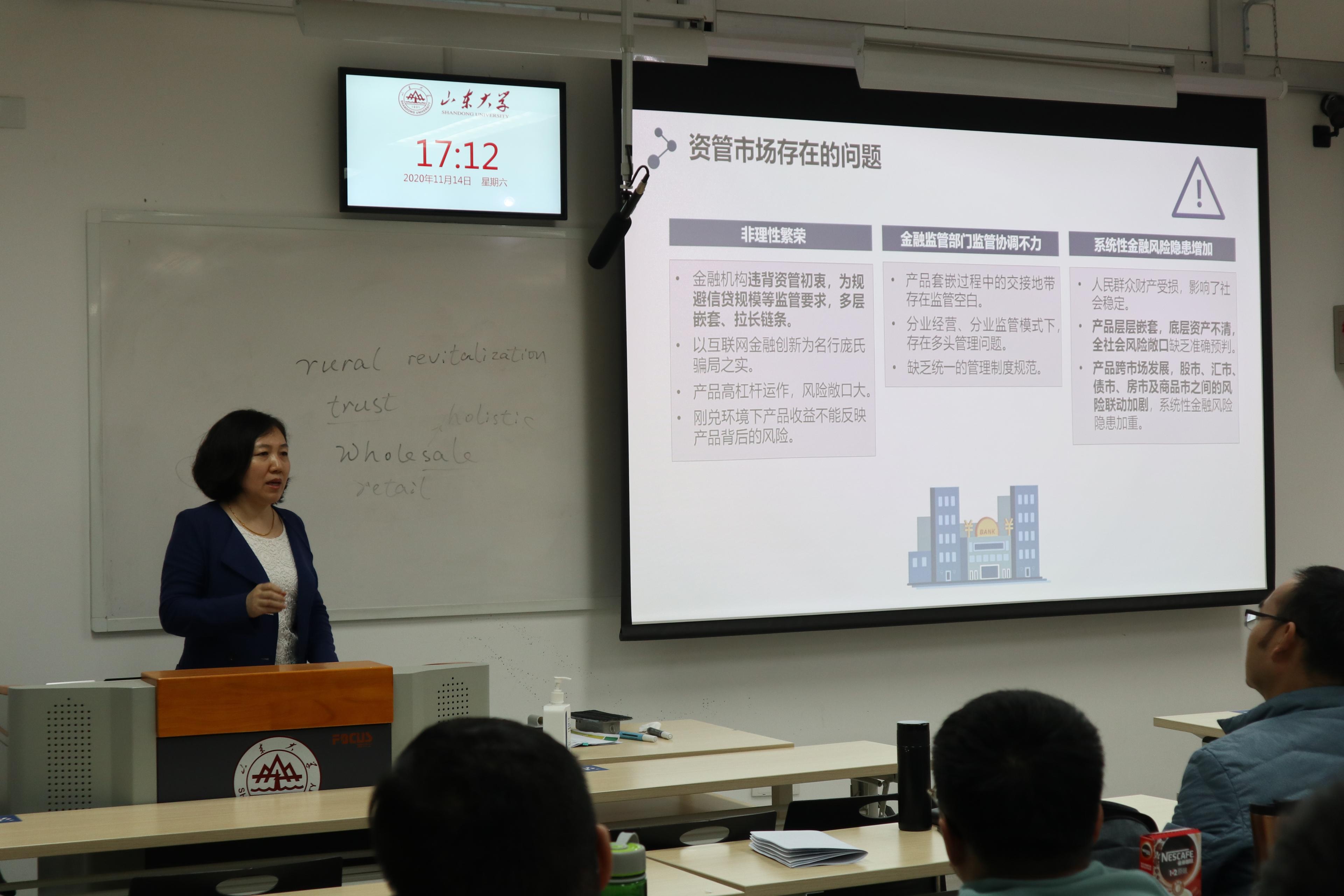 报告指出,此次新规的出台肩负引导资本行业回归本源、金融去杠杆、治理影子银行、引导资金脱虚向实、避免监管套利五点使命;新规建立了投资者保护机制,禁止资金池业务,打击嵌套的穿透式监管;新规反映了监管机构以宏观审慎原则应对系统性风险,以统一监管应对混业经营的监管理念。报告结束后,孔丹凤教授就报告中的有关问题与参会师生进行了深入交流与探讨。