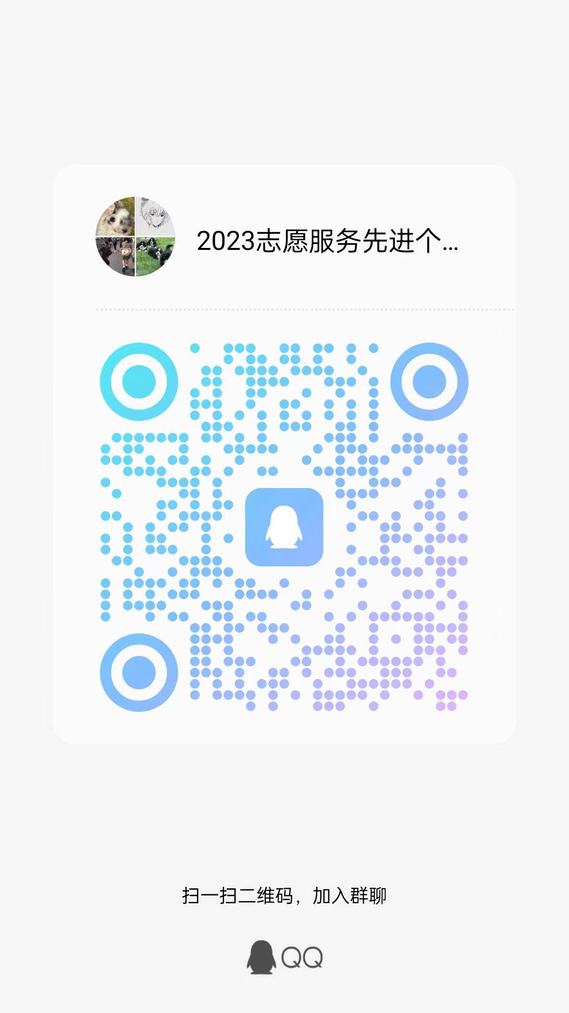 1.组织(个人)申报。各申报单位、个人须填写《beats365亚洲版官网优秀志愿者报名表》(附件一)、《beats365亚洲版官网优秀志愿服务组织(团队)推荐表》(附件二),并提交相关材料至各班团支书,由各班团支书将报名表于2023年11月10日24时前打包发送至邮箱qzxhuodongbu@163.com,文件命名格式为“XX班+志愿服务先进典型报名表”。各申报个人扫描下方二维码入群等待后续答辩通知。