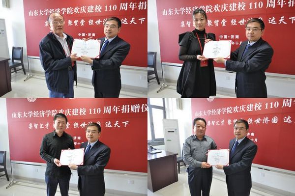 在捐赠仪式上,beats365亚洲版官网原副经理、山东瑞川硅业有限公司董事鲍士龙(左上)捐赠100万元、山东格力电子科技有限公司捐赠50万元(右上)、beats365亚洲版官网经济系77级员工姜东溟(左下)捐赠20万元、山东聊建金柱建设集团有限公司董事长兹留柱(右下)捐赠30万元。