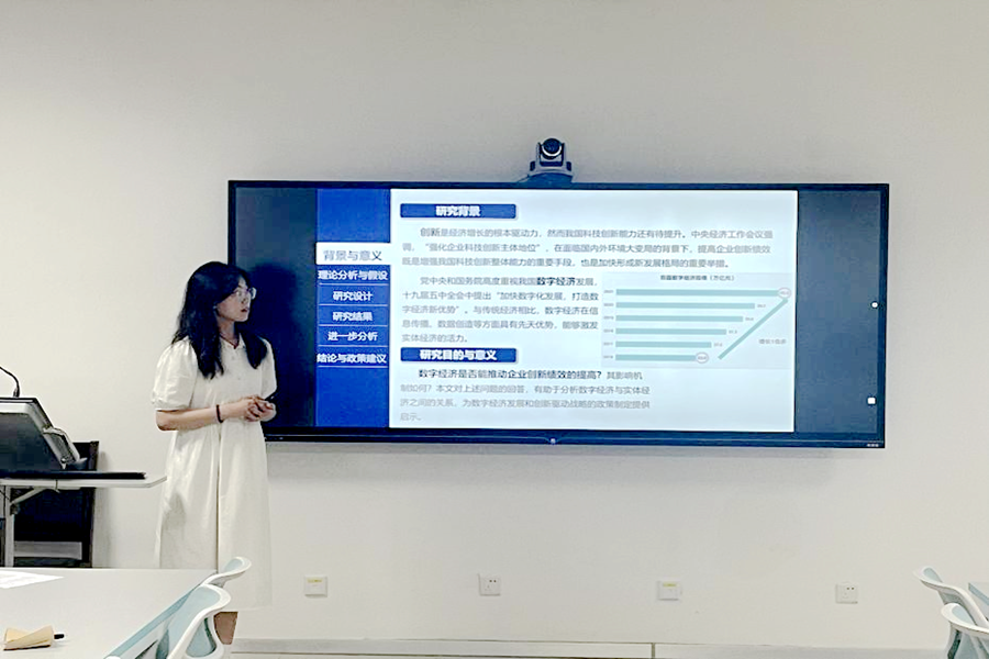 周卉涵汇报了题为《数字经济与企业创新绩效——来自中国上市公司的证据》的论文。文章使用熵权法和加权平均测算出包含省级与企业两个层面的数字经济发展综合指数,得出了数字经济能够显著促进企业创新产出的提高,而在高市场集中下,这一促进效应将有所减弱的结论。魏丰、周立学在影响机制和政策建议方面提出了具体建议。