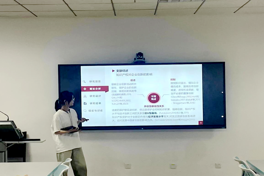 张依美汇报了题为《知识产权示范城市与企业创新质量——激励还是抑制?》的论文,利用2008-2019年中国A股上市公司的专利数据,结合渐进双重差分模型进行实证分析。研究结果表明,知识产权示范城市对企业创新质量产生了显著的抑制作用。程龙、魏丰从异质性分析、机制检验、图表优化等方面给出了详细的指导建议。